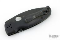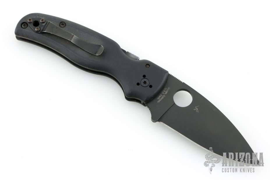 This Shaman Pln by Spyderco features a stonewashed spear point blade with notched thumb and finger rests, thumbhole. The handle has black G-10 scales, inlaid stainless steel liners and a stonewashed stainless steel backspacer, 4-way reversible stainless steel clip, lanyard hole at the butt. Comes with original box and papers. Has scuffs, otherwise good condition.