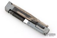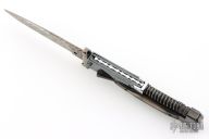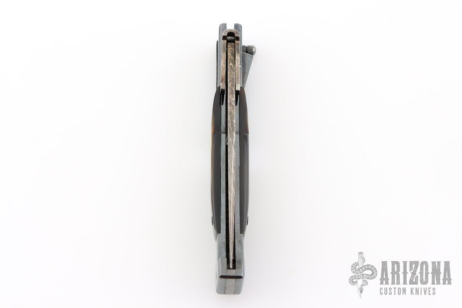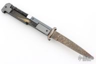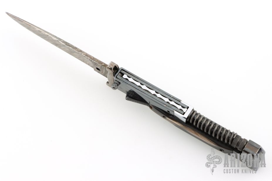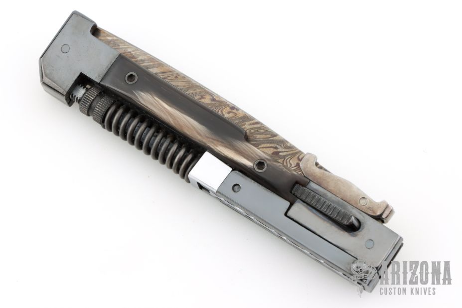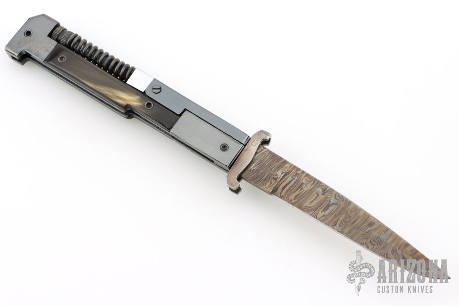 This AK-47 Auto by Agasi Hambartsumian of Armenian Doctor Knives features a Damascus blade. The handle has a blued steel frame and swing guards, buffalo horn scales with black hardware. New from maker. Fires very strong. Has an interesting mechanism. The spring on the spine of the handle is compressed when the blade is closed, and gives the spring extra power when fired.