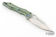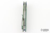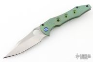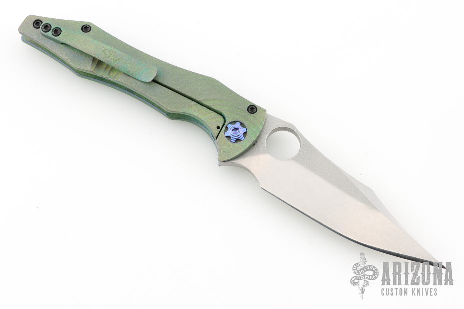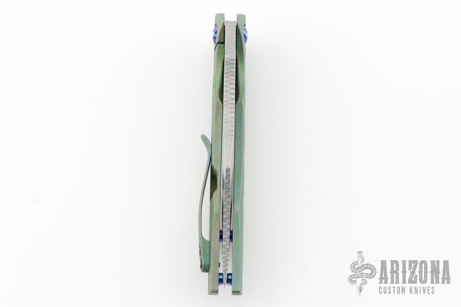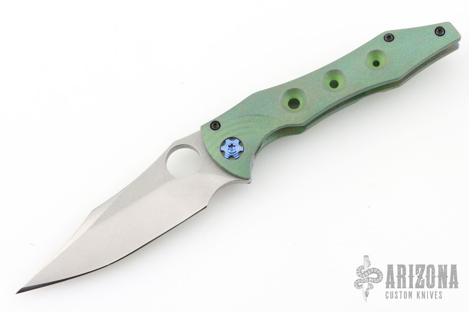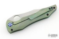 This Tiger by Gavko Knives features a tumble finished blade with textured spine, and a thumbhole. The handle has an anodized and bead blasted titanium frame with matching tip up clip. Very cool iridescent finish between the green/blue/purple colors. Comes with a clasped case. Nice detent, lockup and blade seating. Excellent condition.