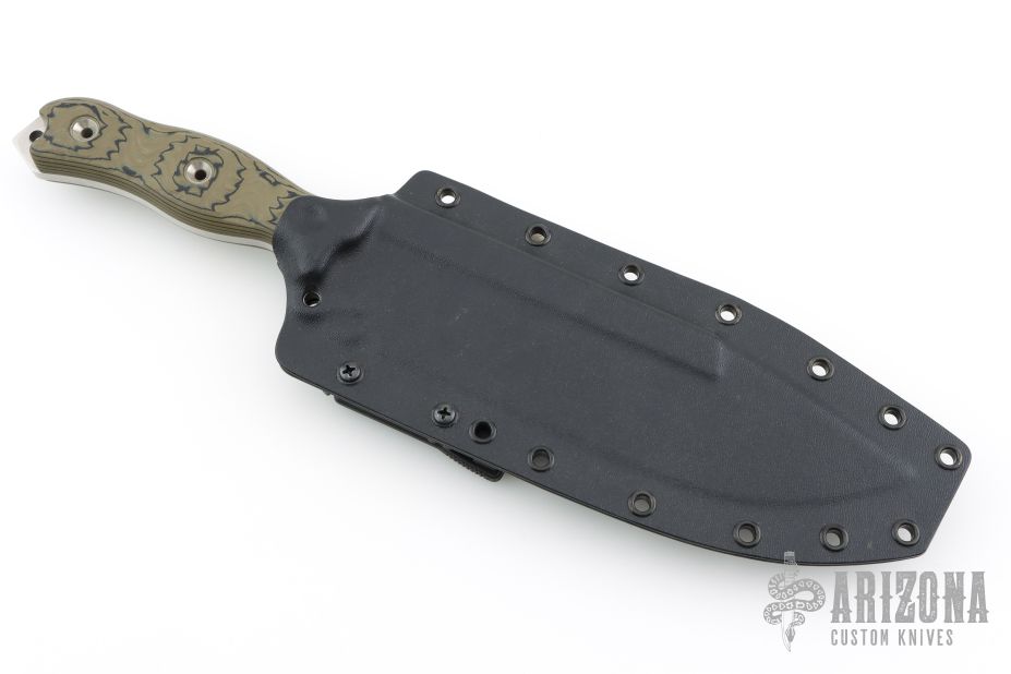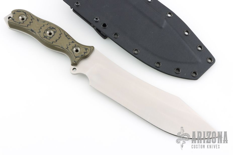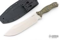 This Battle Grade Bunker Buster by Busse features a satin finished blade with .221" blade stock and 2.116" blade depth, full tang construction. The handle has black/green G-10 scales, extended tang with lanyard hole. Comes with a kydex sheath by BuyBrown, Has some scratches, otherwise excellent condition