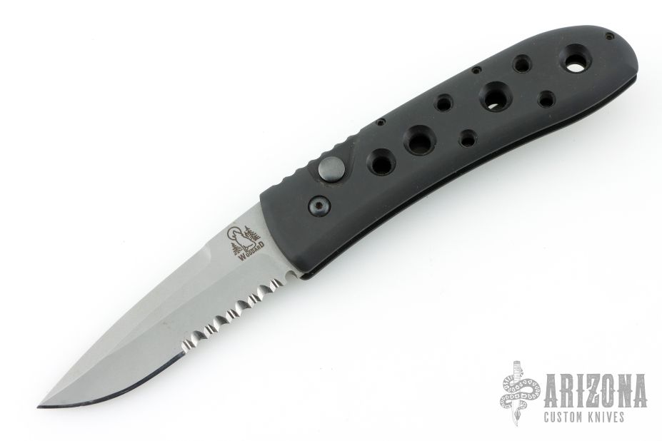 This is a Woodard Knives Fer De Lance side opening automatic with a serrated bead blast finish blade and anodized aluminum frame. Stainless steel clip, tip down carry. Has a couple light scuffs, otherwise excellent condition.