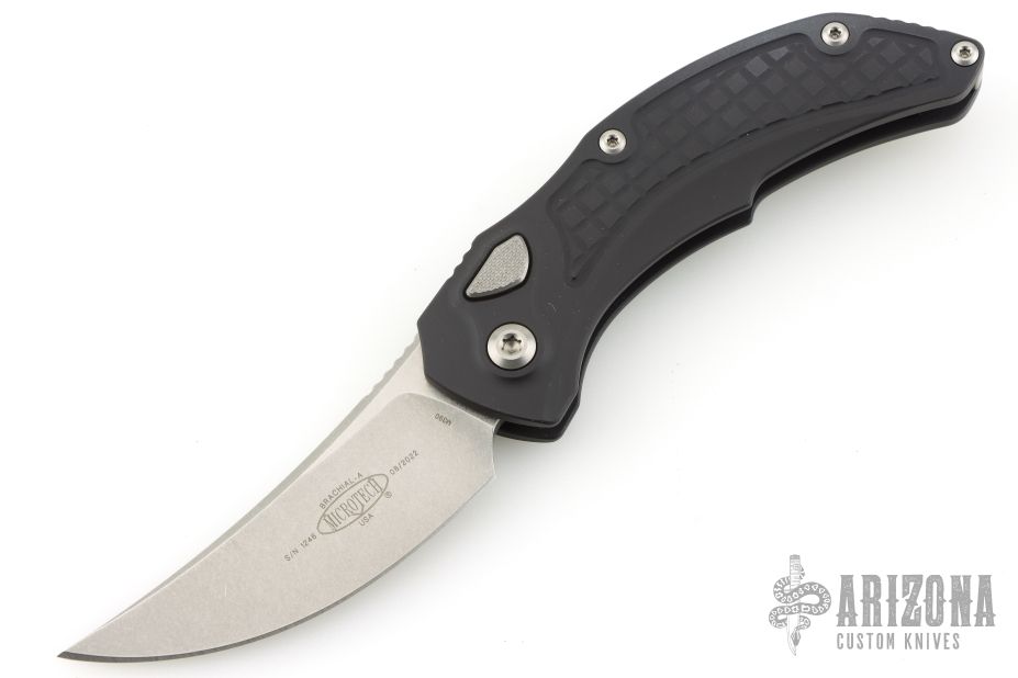 The Brachial is a Persian-style design collaboration with Bastinelli Knives bringing a uniquely styled piece to the Microtech lineup. We love everything about this knife. From its look to its ergonomics, industry-leading action, and materials; it will serve you well for years to come. It's also suited for a myriad of applications ranging from EDC to tactical and literally everything in-between. Includes a frag-pattern machined finish for additional grip, an excellently designed pocket clip, and a hidden lanyard slot that will accommodate 550 paracord. This is one heck of a knife, get it while you can!