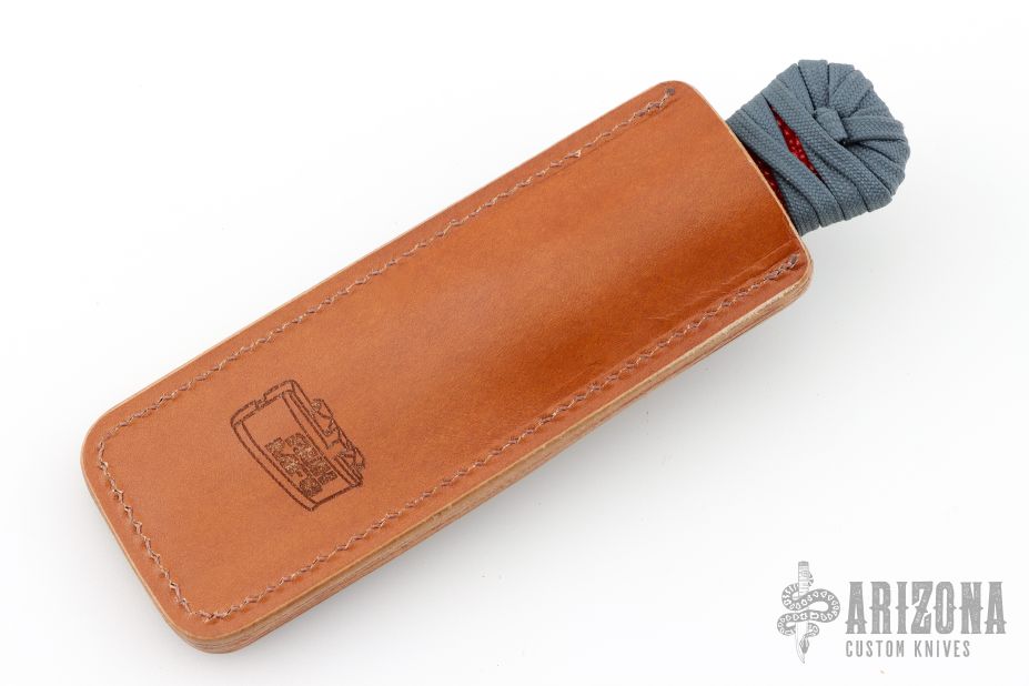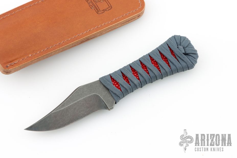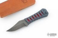 This Pocket Bowie by Auxiliary Manufacturing features an acid tumbled blade with .195" blade stock and 1.198" blade depth. The handle has a cord wrapped handle over red stingray skin. Comes with a brown leather sheath with Ulti-clip. Excellent condition.
