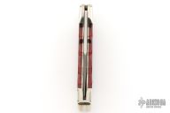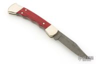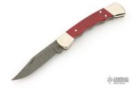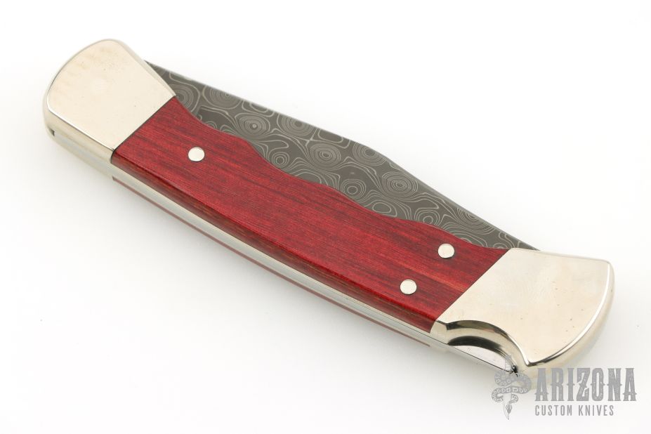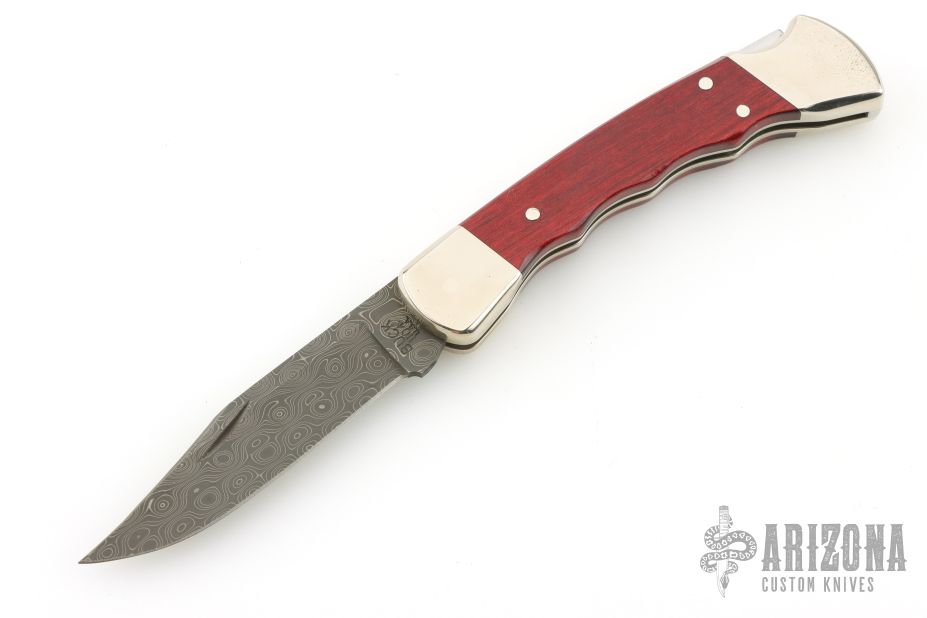 This lock back folder by Buck features a Damascus clip point blade with nail nick. The handle has nickel silver frame and red wood inlays. Comes with original box, papers, and nylon belt sheath. Excellent condition.