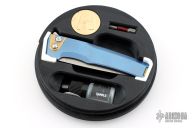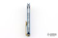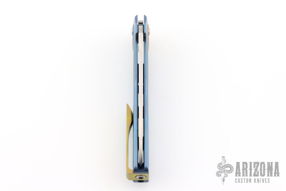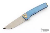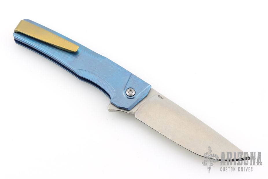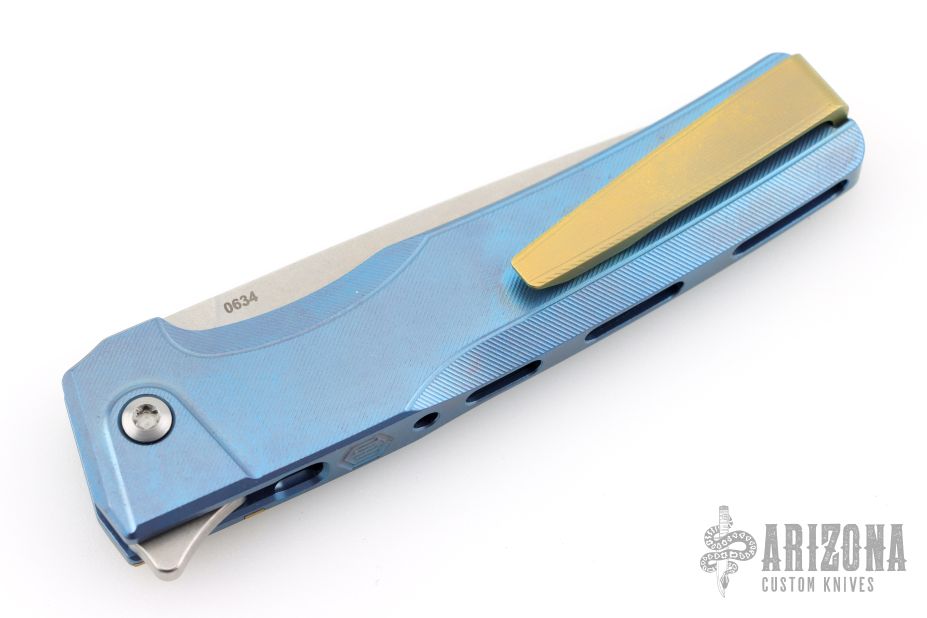 This Sonora by Machine Wise features a stonewashed blade with flipper tab. The handle is anodized titanium with a milled integral construction. Button lock open and closure, with L/R reversible tip up clip. Includes original 3D printed box, tool, lube and card. S/N 634. Excellent condition.