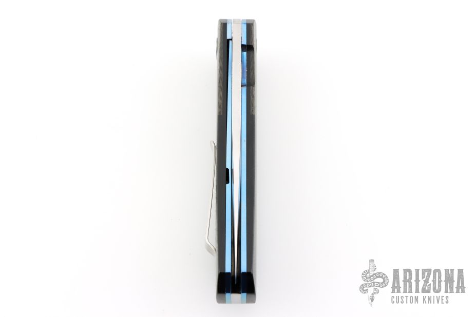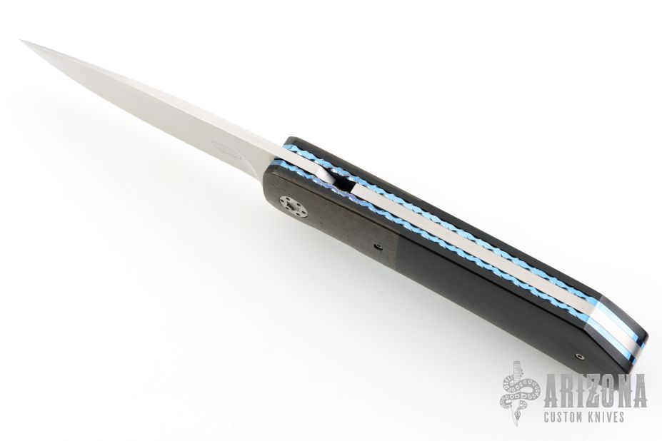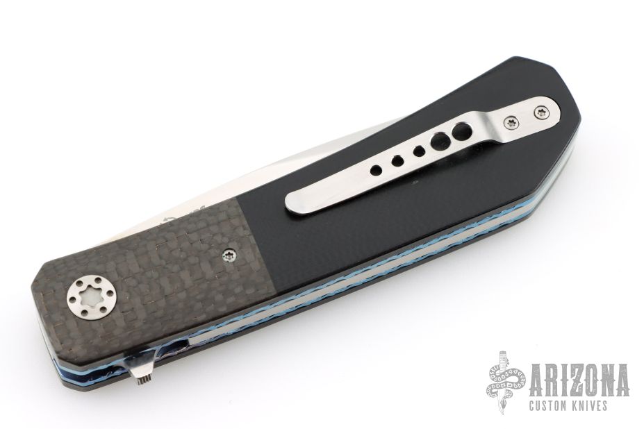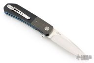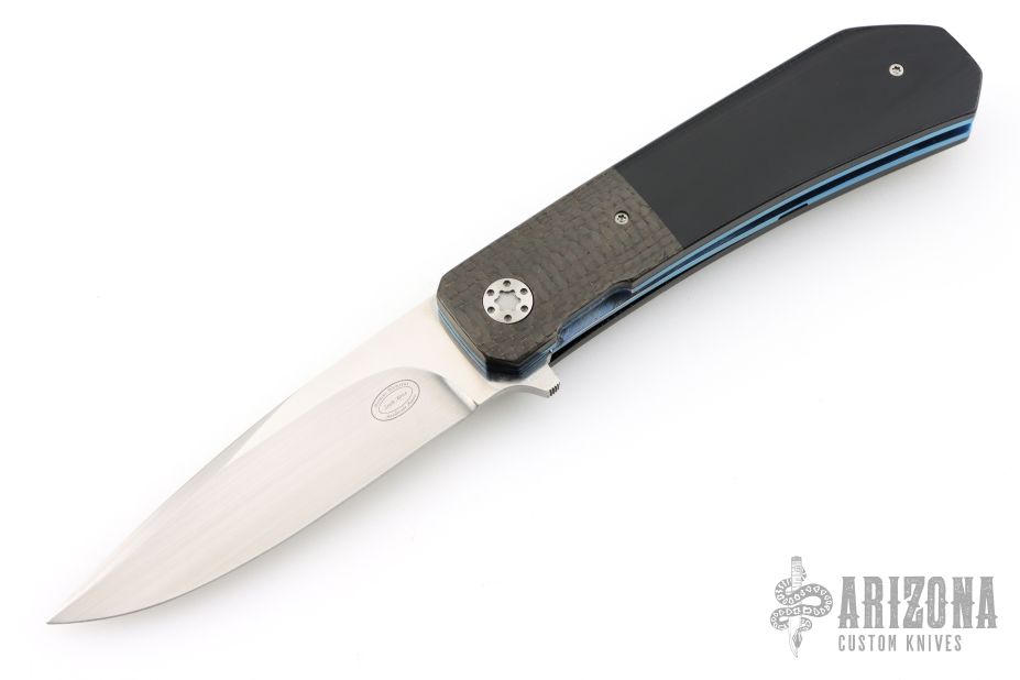 This LL12 linerlock flipper by Herucus Blomerus features a hand rub satin finished blade with polished flats and flipper. The handle has lightning strike carbon fiber bolsters, black G-10 scales, anodized titanium liners with fileworked spines, stainless steel backspacer and a tip up clip. Rides on IKBS, nice detent, lockup and blade seating. Comes with nylon velcro case. Excellent condition.