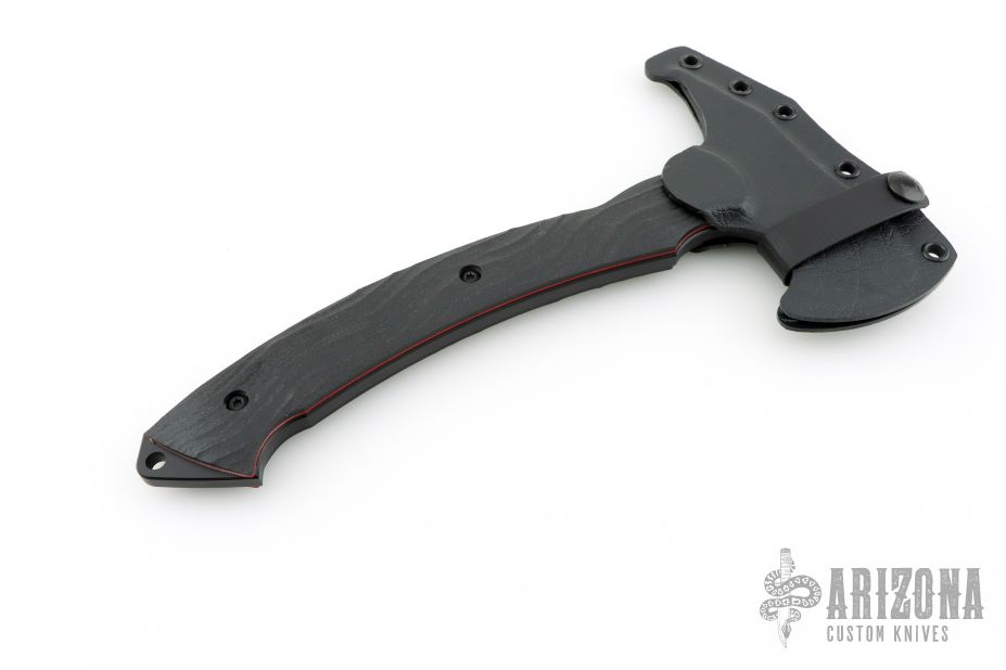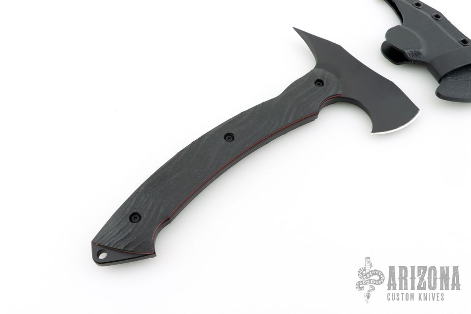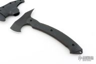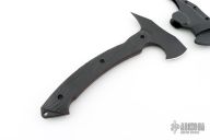 The Tomahawk by Toor features a black blade and tang, .253" blade stock and 2" blade depth, full tang construction with shadow black G-10 scales. Comes with original box, papers and kydex sheath. Excellent condition. #1013 on the blade.