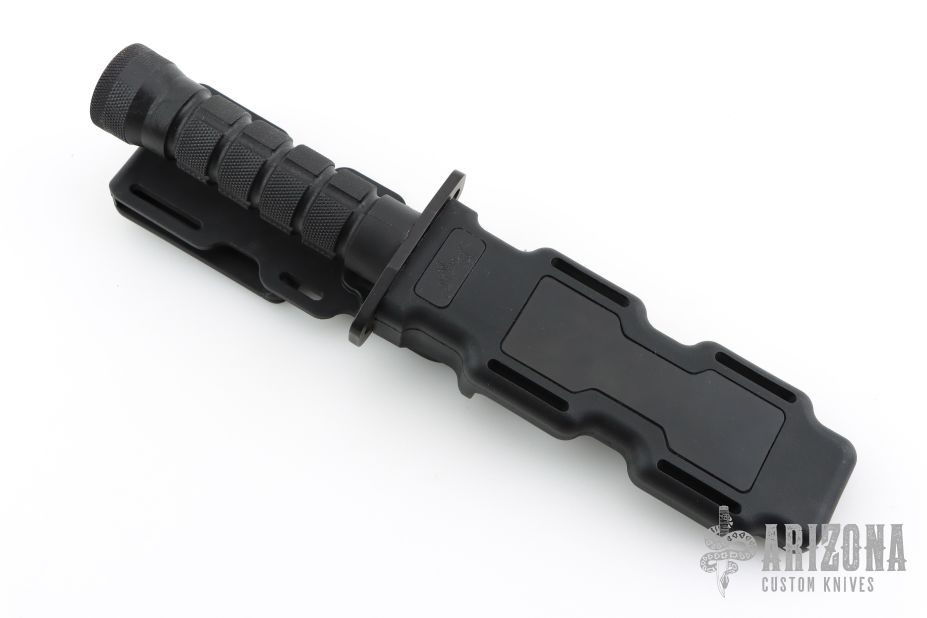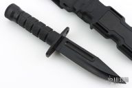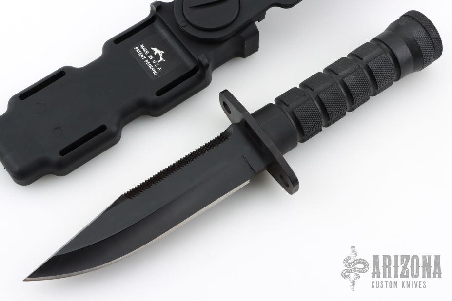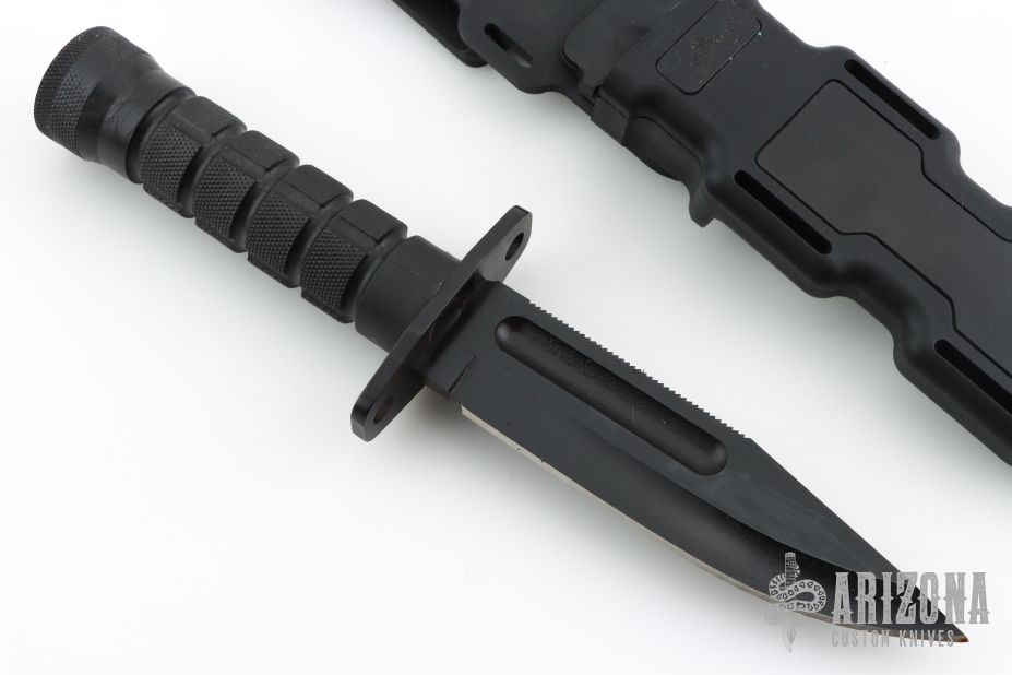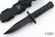 This C.U.K. by Phrobis features a black blade with sawteeth on the spine and a large fuller, .200" blade stock and 1.283" blade depth, hidden tang construction. The handle has a black steel guard and black zytel grip. Comes with original black zytel sheath. Excellent condition. This knife is sterile and has no markings. Used by Seal Teams in Desert Storm. Less than 500 made.