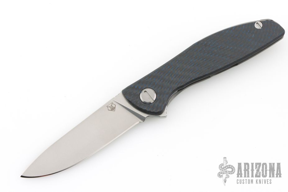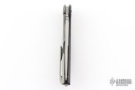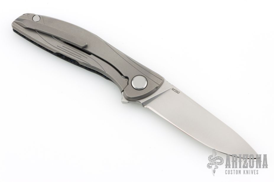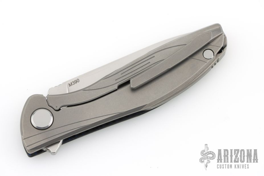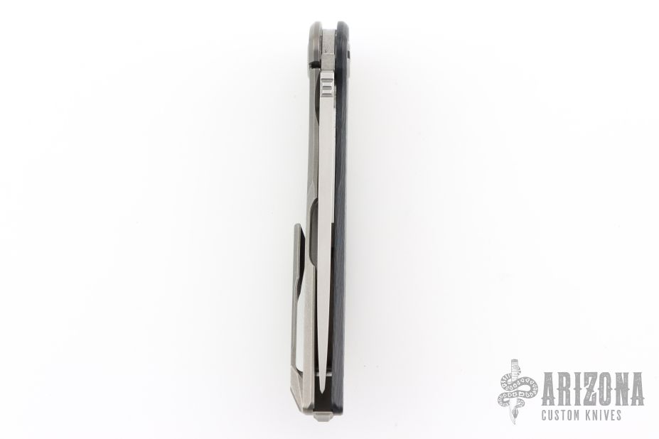 This HatiOn Lite by Shirogorov Knives features a tumble finished drop point blade with flipper. The handle has a black/blue carbon fiber "A" side and a tumbled titanium lockside over a titanium backspacer with recessed lanyard bail. 3D Machined titanium pocket clip is positioned for right hand, tip up carry. MRBS. Comes with original box and COA. Has been resharpened, otherwise excellent condition.