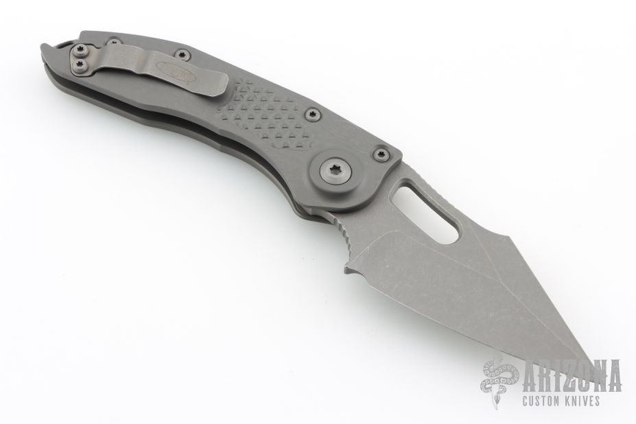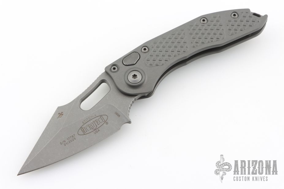 This Stitch Auto by Microtech Knives features an Apocalyptic finished blade and false top edge, notched thumb and finger rests. The handle has a "Natural Clear" milled aluminum handle with a bead blasted titanium backspacer and a bead blasted stainless steel clip, tip up carry, lanyard hole at the butt. Includes original box and papers.  S/N of 17797 and dated 01/2025. Excellent Condition.