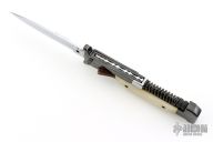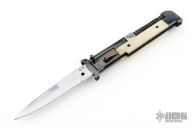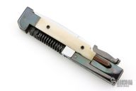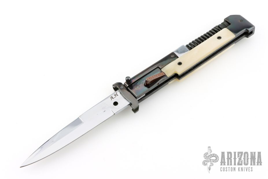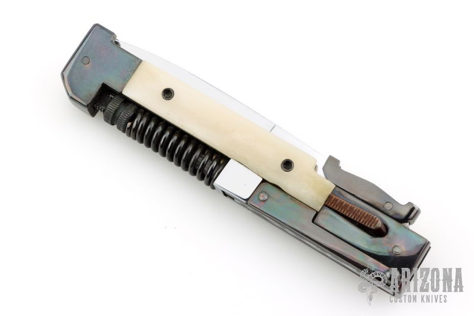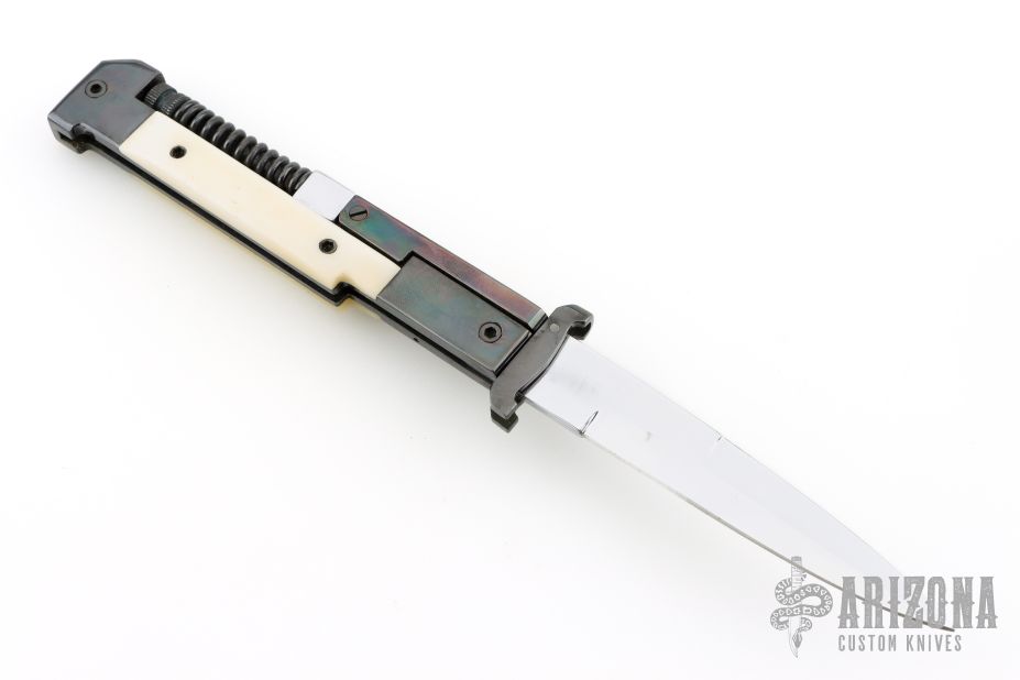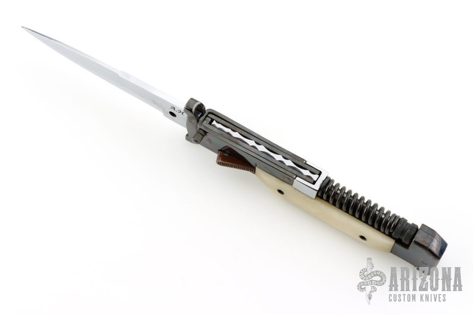 This AK-47 Auto by Agasi Hambartsumian of Armenian Doctor Knives features a mirror polished blade. The handle has a blued steel frame and swing guards, white bone scales with black hardware. New from maker. Fires very strong. Has an interesting mechanism. The spring on the spine of the handle is compressed when the blade is closed, and gives the spring extra power when fired.