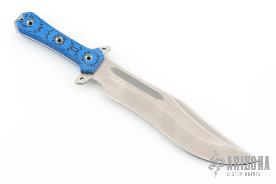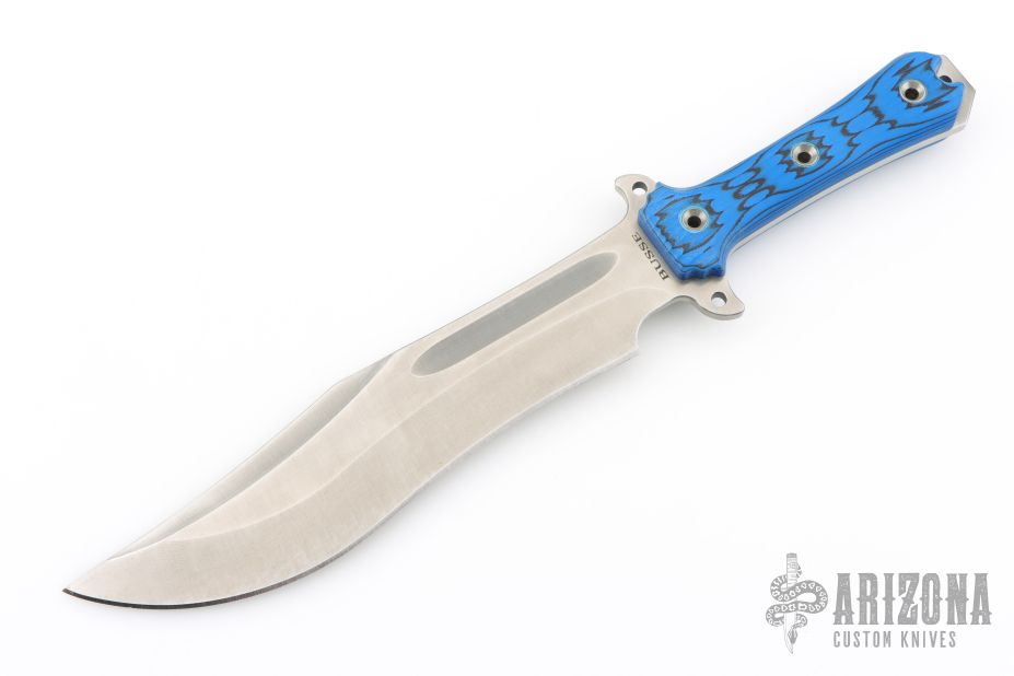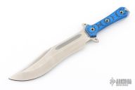 This Anorexic Trough Raider by Busse and has a stonewashed blade with false top edge and fullers, full tang construction with .211" blade stock and 2.077" blade depth. The handle has blue/black G-10 scales, extended tang with lanyard holes. Excellent condition.