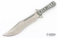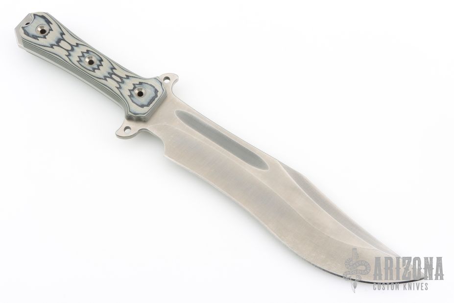 This Anorexic Trough Raider by Busse and has a stonewashed blade with false top edge and fullers, full tang construction with .211" blade stock and 2.080" blade depth. The handle has tan/black G-10 scales, extended tang with lanyard holes. Excellent condition.