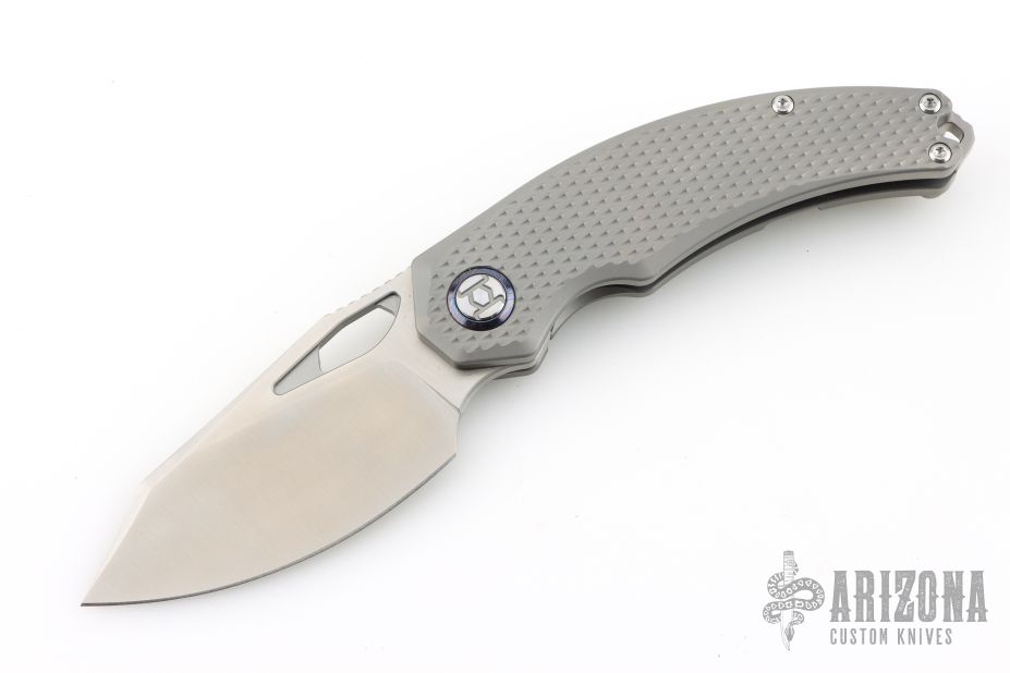 This knife by Kunwu Knives features a satin finished blade with notched thumbrest and front flipper. The handle has a textured titanium frame with matching backspacer and tip up clip, mokuti pivot collar. Includes the original box and papers. Has a couple light scuffs and scratches, otherwise Excellent condition.