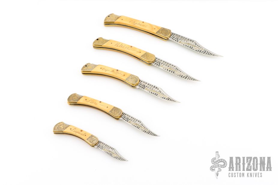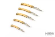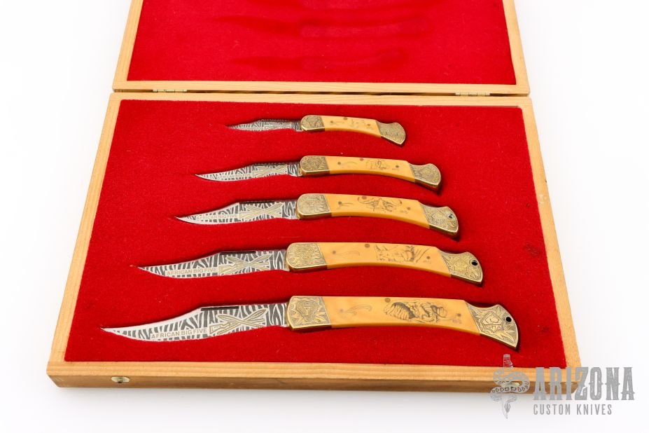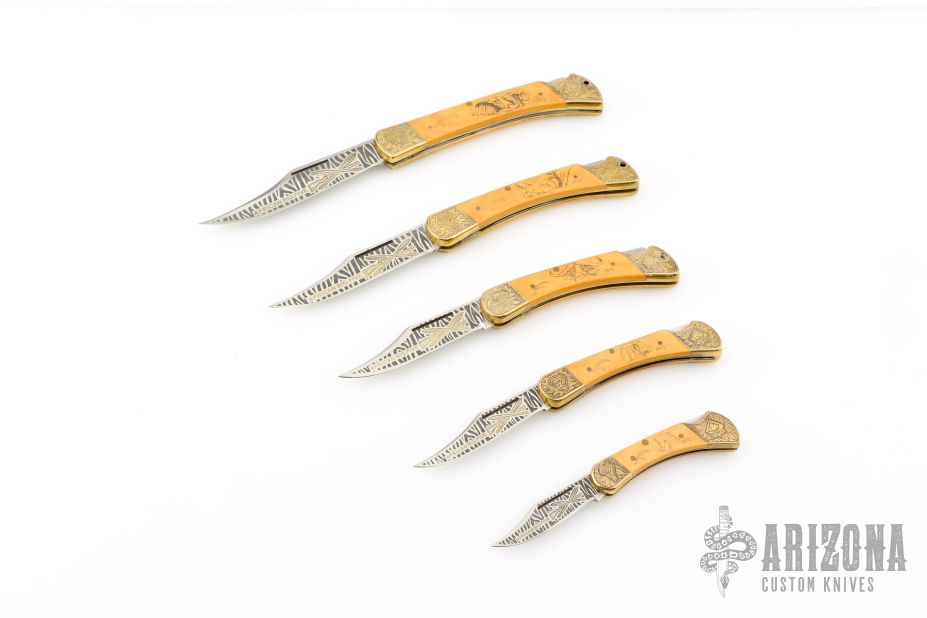 Very Fine Blade Etching on Both sides of Blade with Full Gold Fill on each knife.