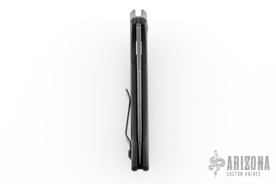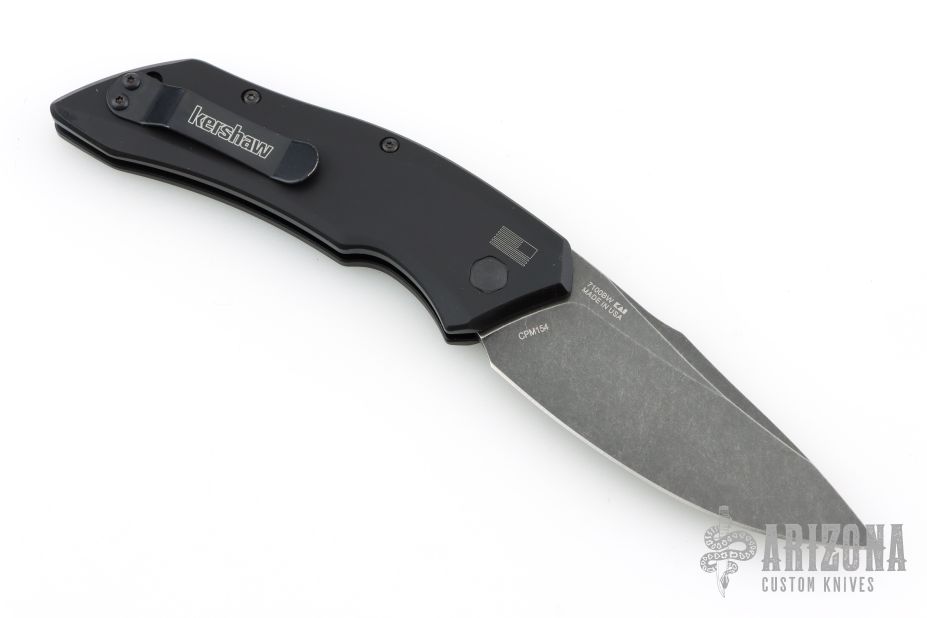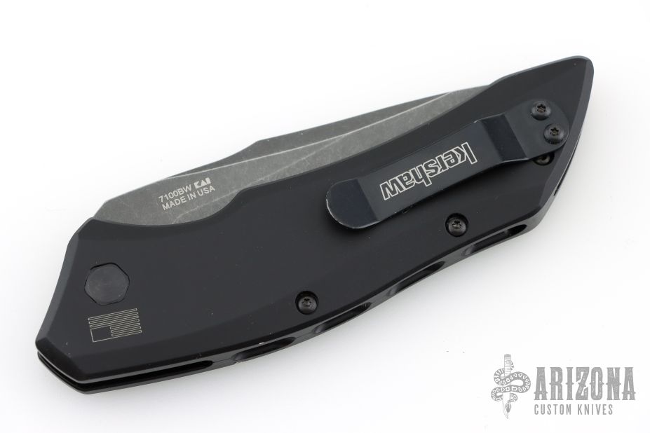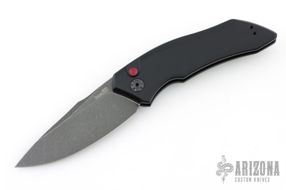 This Launch Auto #1 by Kershaw features a blackwash finished blade with swedge. The handle is black aluminum with push button and tip up reversible black stainless steel clip, lanyard hole at the butt. Comes with original box and papers. Has a couple light scuffs on the clip, otherwise excellent condition.