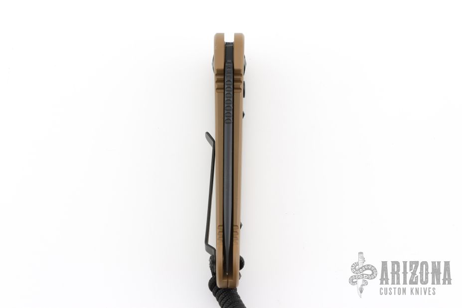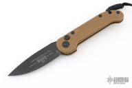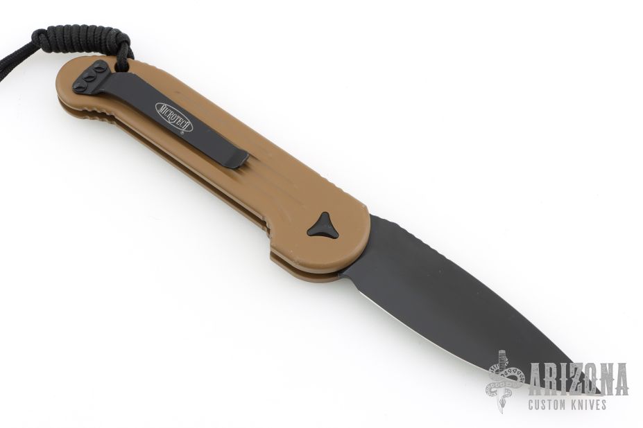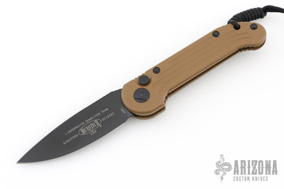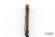 This LUDT side opening automatic by Microtech has a black finished blade with a standard edge and a contoured tan aluminum frame. Stainless steel clip. Dated 07/2022 and serial number 27000. Comes with original box and papers. Excellent condition.