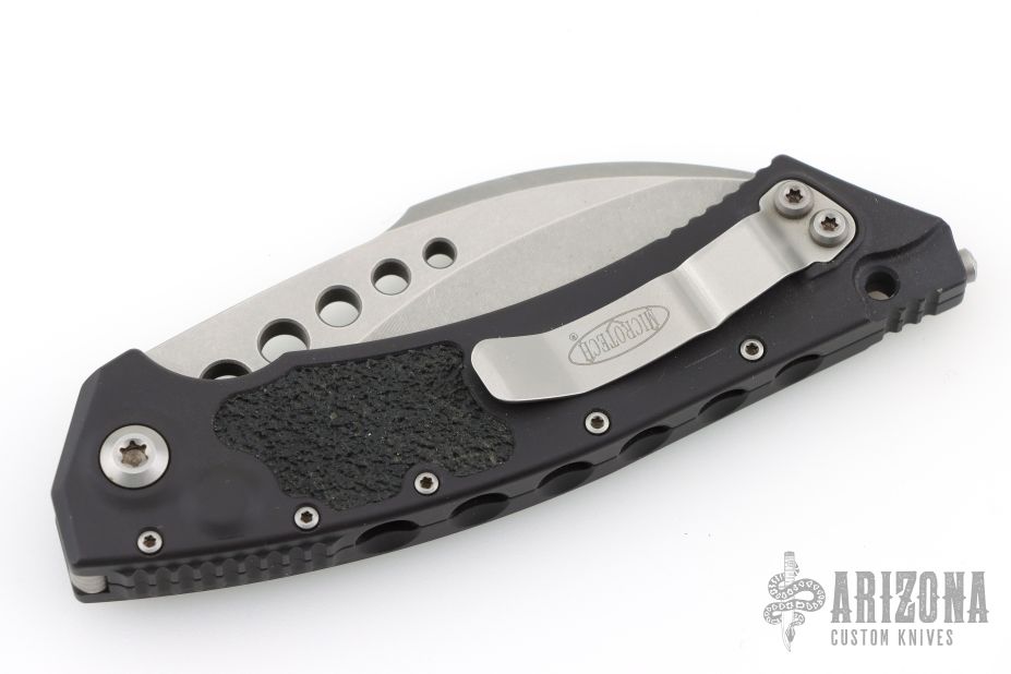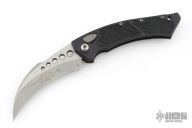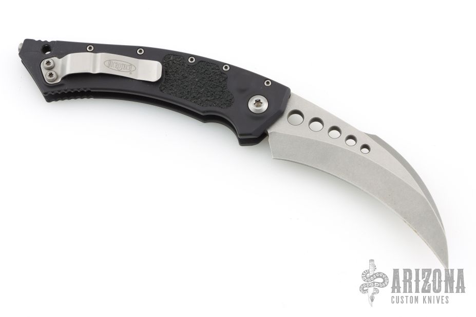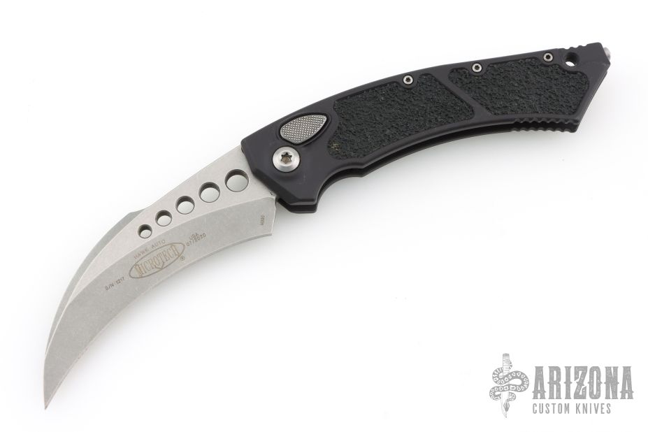 This Hawk Auto by Microtech Knives features a stonewashed hawkbill blade. The handle has a black aluminum frame with blasted stainless steel hardware and tip up clip. Dated 07/2020 and s/n 1217. Excellent Condition. Comes with original box and papers.