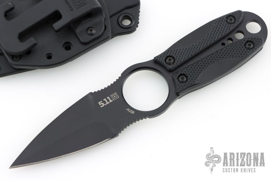 Improved injection molded 5.11 UltraSheath for boot, neck, belt, and MOLLE carry options. Ambidextrous kydex sheath with 12 carry angles. Removable FRN scales are scratch, crack, and break resistant and are contoured and textured for maximum grip with bare or gloved hands. Includes break-away neck chain, Torx wrench, and mounting strap for 8" 5.11 Tactical Boots. This small boot knife makes an excellent last ditch, backup blade. It's compact and light enough to be carried all the time without you even knowing it's there. The blade is large enough for utility tasks and the ergonomic handle design goes perfectly with the spear point blade design. Get one in hand and you will not be disappointed. Excellent condition.
