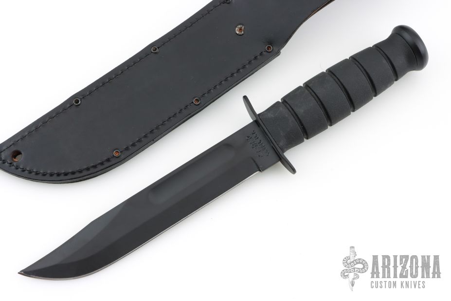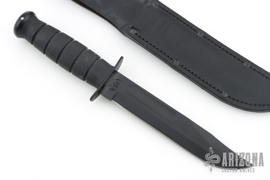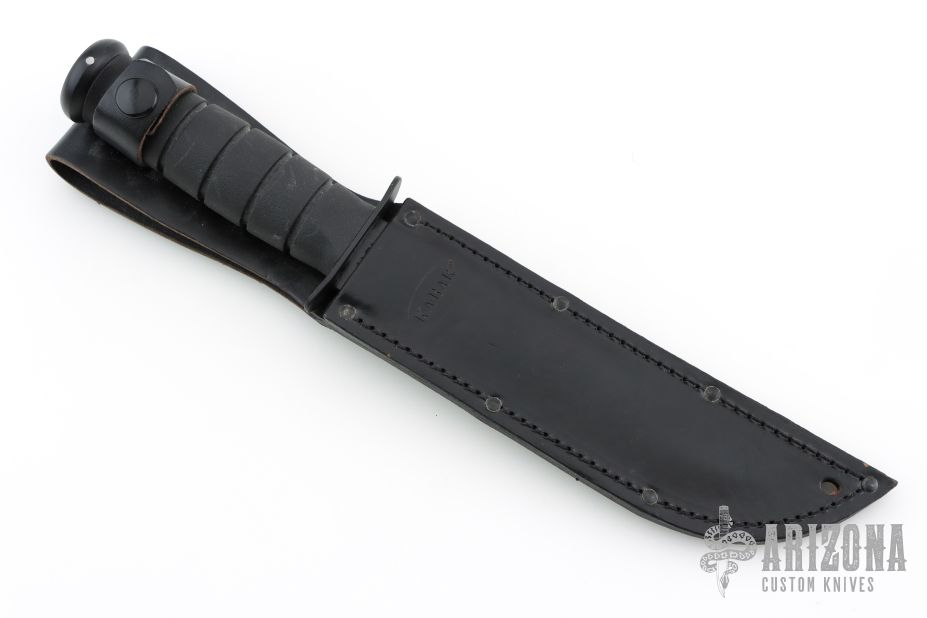 This KA-BAR Fighting Knife has a carbon steel black clipoint blade, marked "KA-BAR/ Olean, N.Y. USA", and steel double guard. Blade stock is .170", depth 1.229". The handle has a rubber grip wth a black steel butt cap.  Includes original black leather sheath. Has a couple light scuffs, otherwise excellent condition.