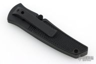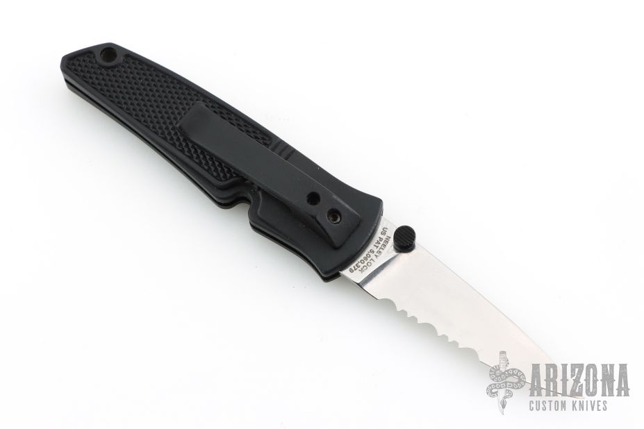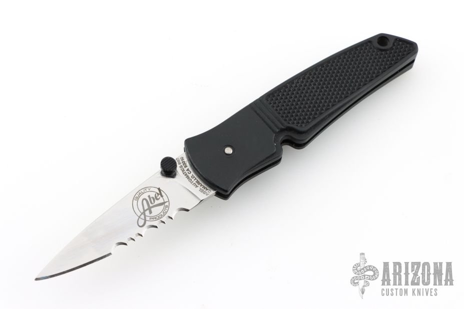 This knife by Abel features a polished serrated blade with dual thumbstuds. The handle is black FRN. This knife features the Neeley Lock. The knife opens normally, but to close the knife, pull the thumbstuds forward and the lock will release and the knife can close. Has some light scuffs and scratches, great condition otherwise.