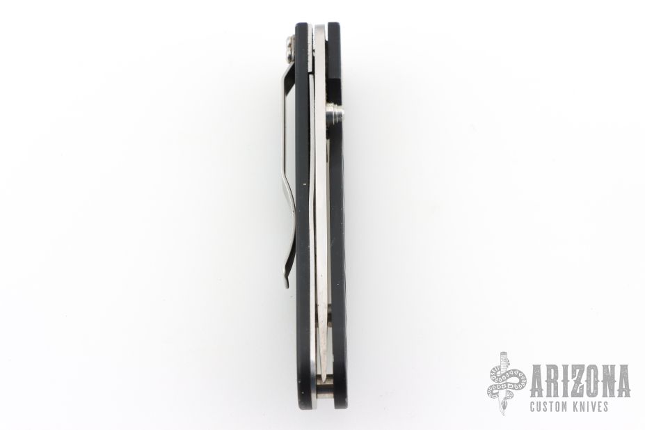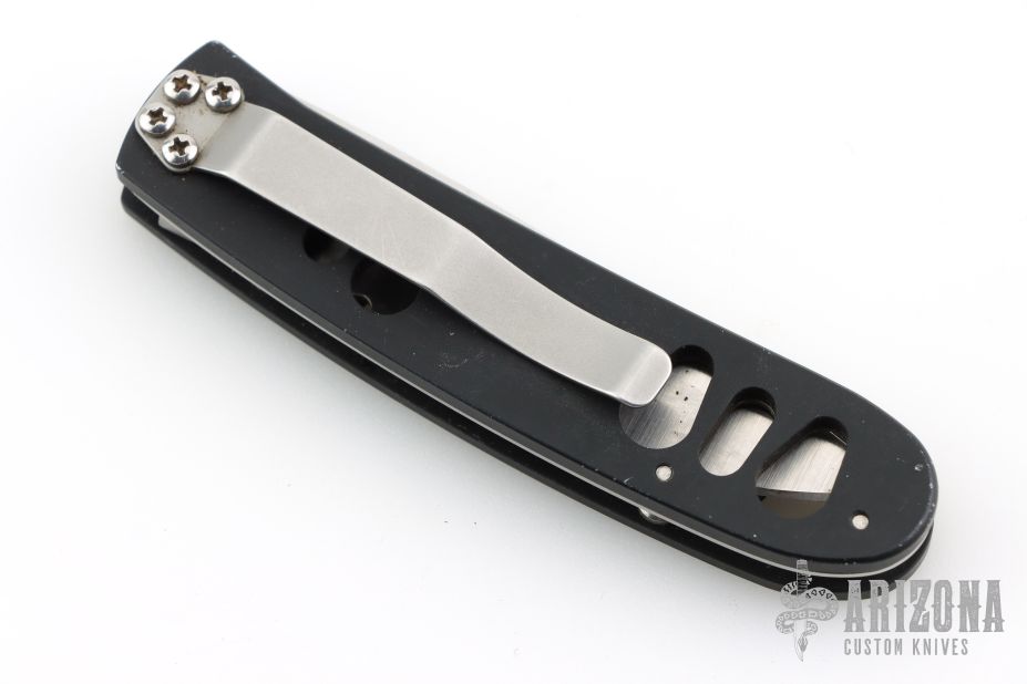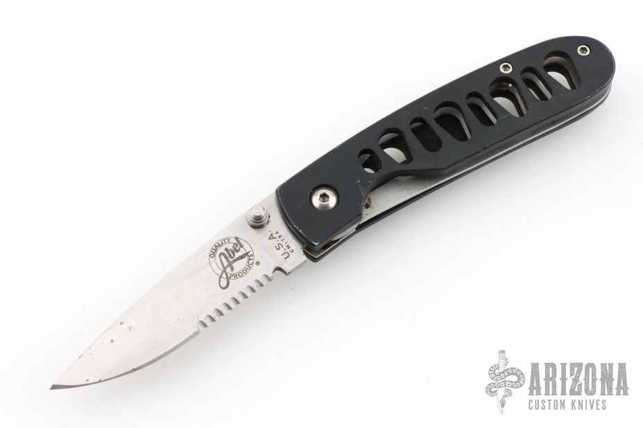 This knife by Abel Fishing Reels features a satin finished drop point blade with partial serrations and a single thumb stud. The knife is fully made in the USA of high carbon, high chrome, 154CM knife grade stainless steel. The blade is hardened to 60RC; the handle or frame of the knife is cold finished 6061-T6 aircraft quality aluminum. Bead blasted stainless steel tip down pocket clip. Has some scuffs, scratches, and a little rust. Good condition otherwise.