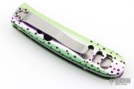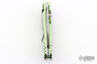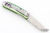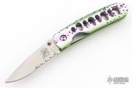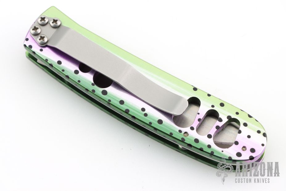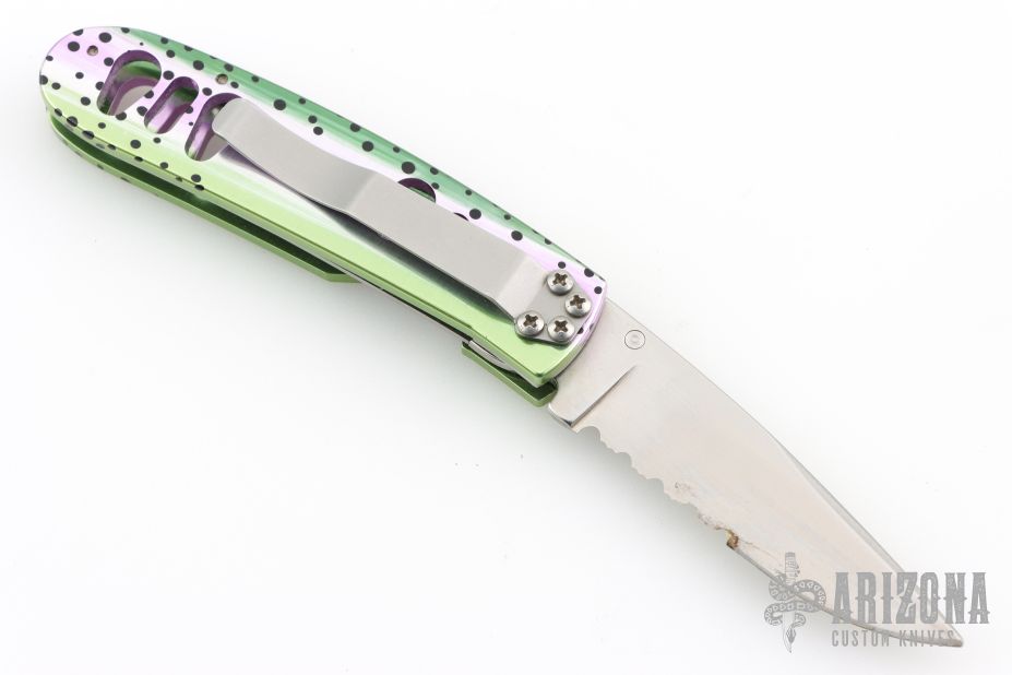 This knife by Abel Fishing Reels features a satin finished drop point blade and a single thumb stud. The knife is fully made in the USA of high carbon, high chrome, 154CM knife grade stainless steel. The blade is hardened to 60RC; the handle or frame of the knife is cold finished 6061-T6 aircraft quality aluminum. Bead blasted stainless steel tip down pocket clip. Has some light scuffs and scratches, great overall condition.