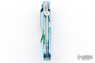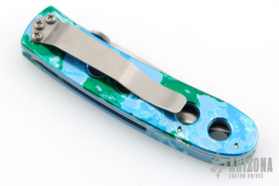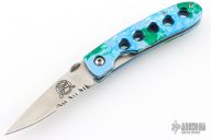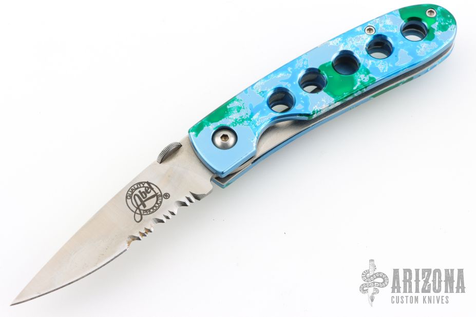 This knife by Abel Fishing Reels features a satin finished drop point blade and a single thumb stud. The knife is fully made in the USA of high carbon, high chrome, 154CM knife grade stainless steel. The blade is hardened to 60RC; the handle or frame of the knife is cold finished 6061-T6 aircraft quality aluminum. Bead blasted stainless steel tip down pocket clip. Has some light scuffs and scratches, great overall condition.