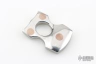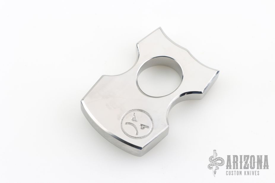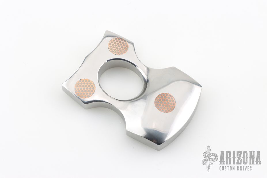 This Knuckle by MG Customs is made of polished steel with super conductor inlays, .432" thick, with a palm-swell measuring .588". Comes in a leather pouch. New from maker.