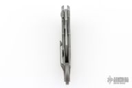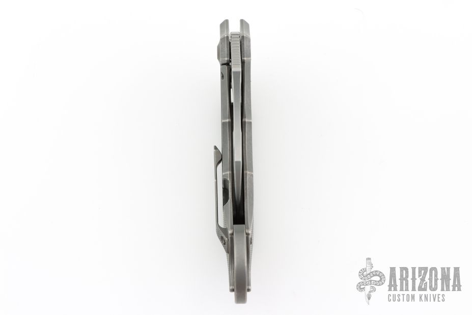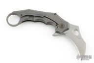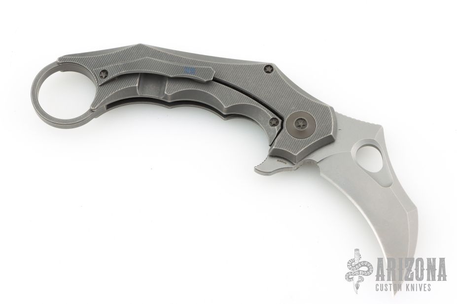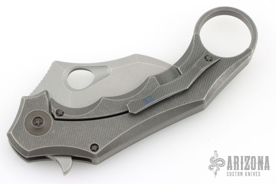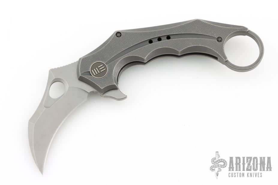 This folding karambit by WE Knife Company features a stonewashed hawkbill blade with thumbhole and notched thumbrest and flipper. The handle has a milled, anodized and tumbled titanium frame with matching tip up clip and backspacer with finger hole. Rides on bearings. Comes with maker's nylon zippered case and papers. Has a few scuffs and is a little dirty, otherwise Excellent condition.