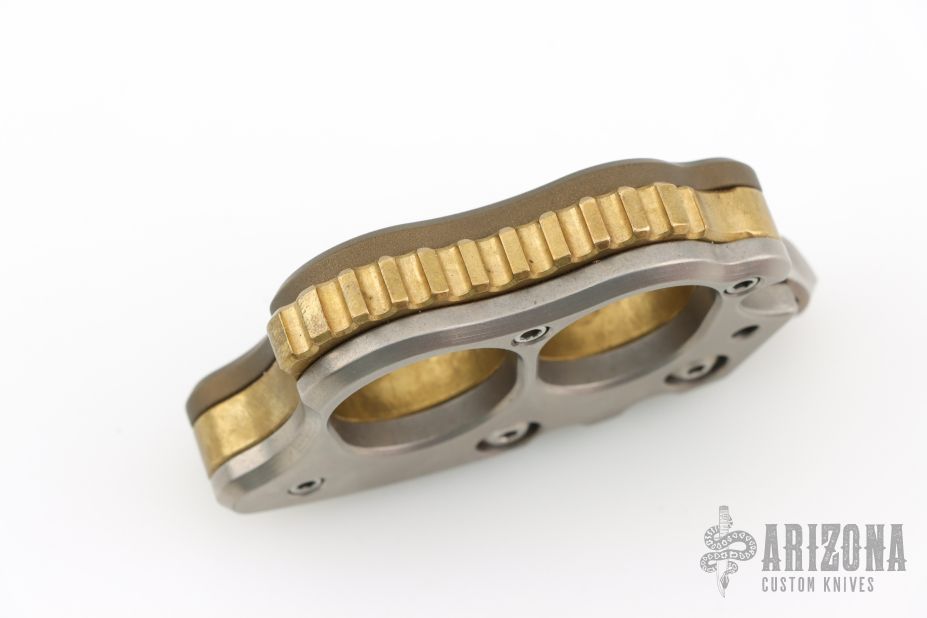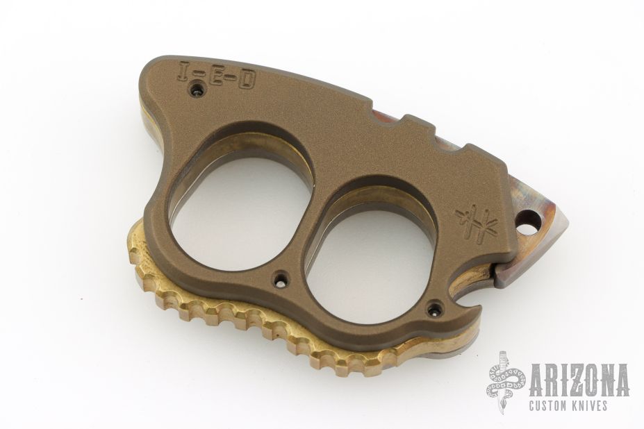 This I.E.D. by TS Heeter is made of bead blast finished titanium, bronze anodized titanium and antique brass. Comes in a soft pouch. Excellent condition.