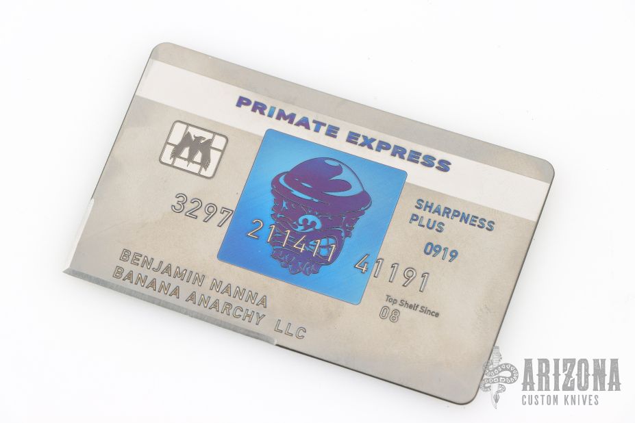 Primate Express Titanium Card Blade by Mummert Knives. Has Fiber Laser Color and Deep Etch. Tungsten carbide edge, RC 72. Comes in a WPPL Blocking Sleeve with original bag. Has a couple light scuffs, excellent condition otherwise.