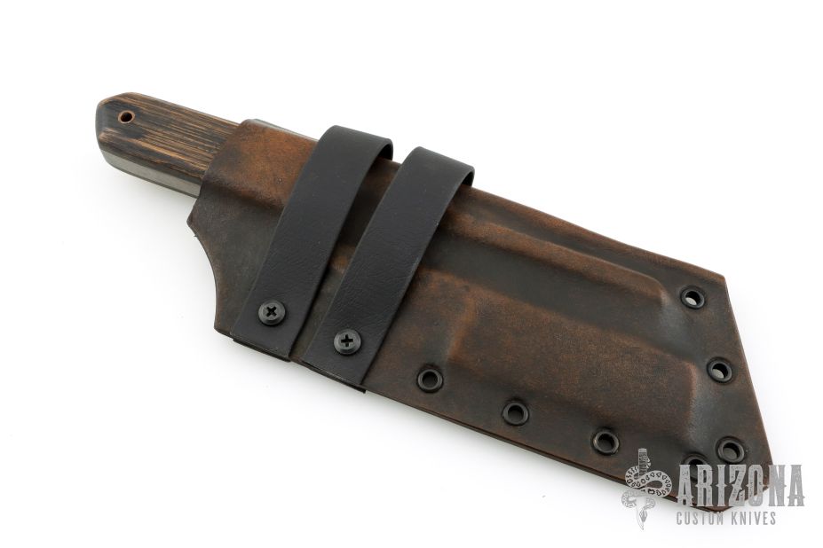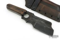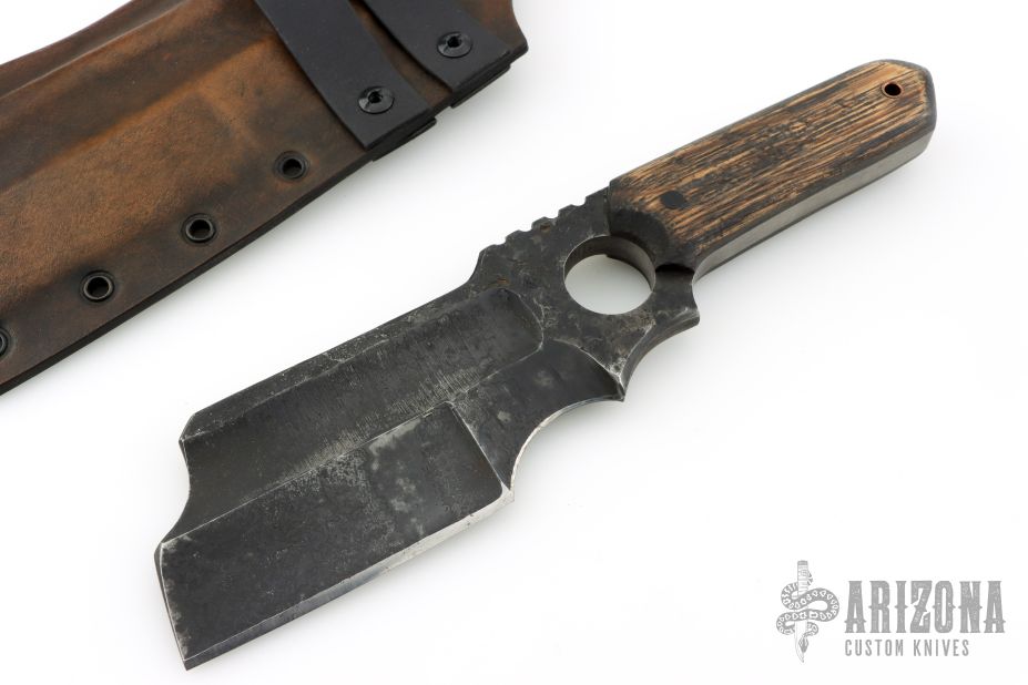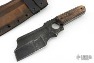 This cleaver by Dylan Grace features a hand forged blade with notched thumbrest, .376" blade stock and 2.310" blade depth, full tang construction. The handle has wood scales (from an old bourbon barrel) with black pin and a lanyard hole at the butt. Comes with a wet formed leather sheath. Excellent condition.