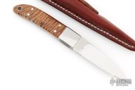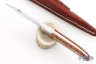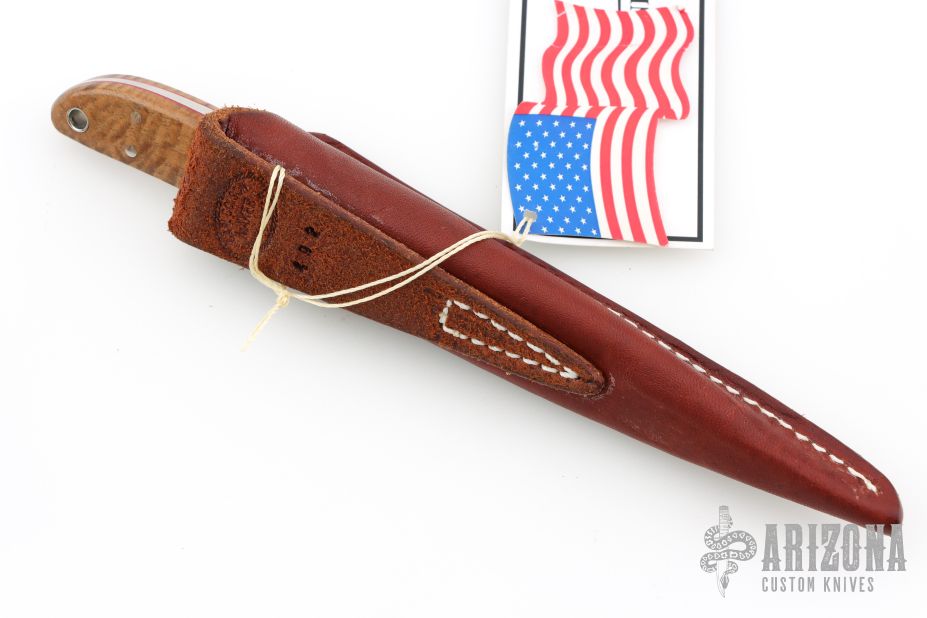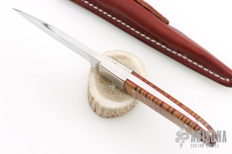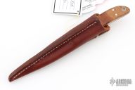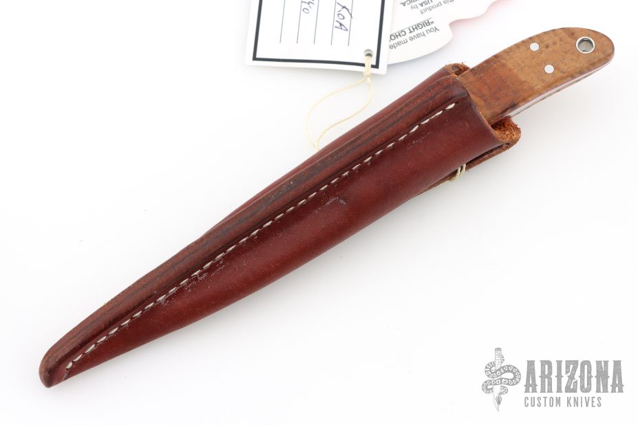 This Loveless Style Randall Hunter by Carl Colson features a mirror polished blade with notched finger rest, .180" blade stock and .839" blade depth, full tapered tang construction. The handle has a 416 stainless steel bolsters and pins, lanyard hole at the butt, AAAA Hawaiian Koa with red liners. Comes with a brown leather sheath made by Carl Colson. Comes with COA dated 03-16-2019 and #492 on the blade and sheath. Has some light scuffs and scratches, great overall condition.