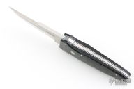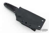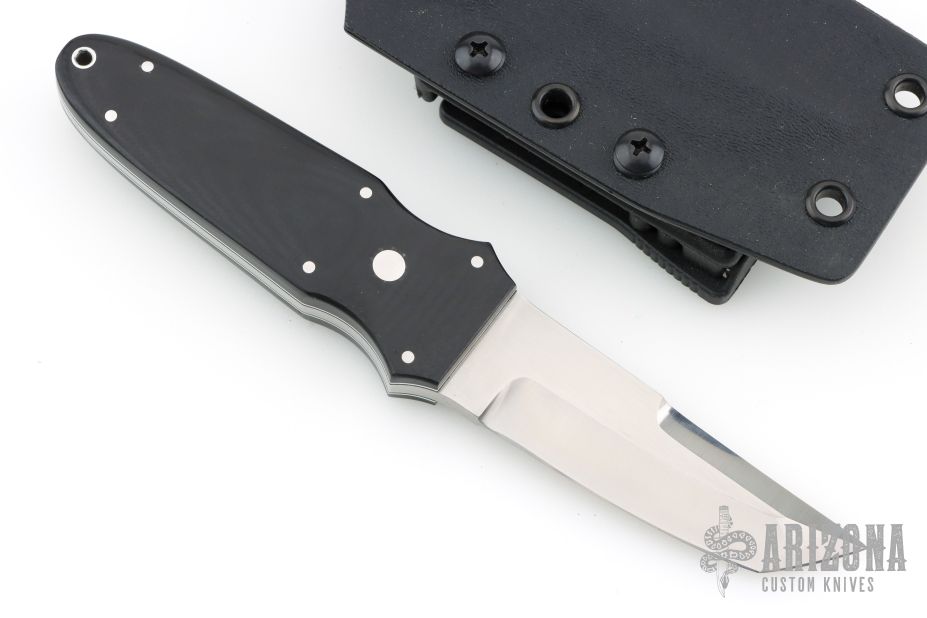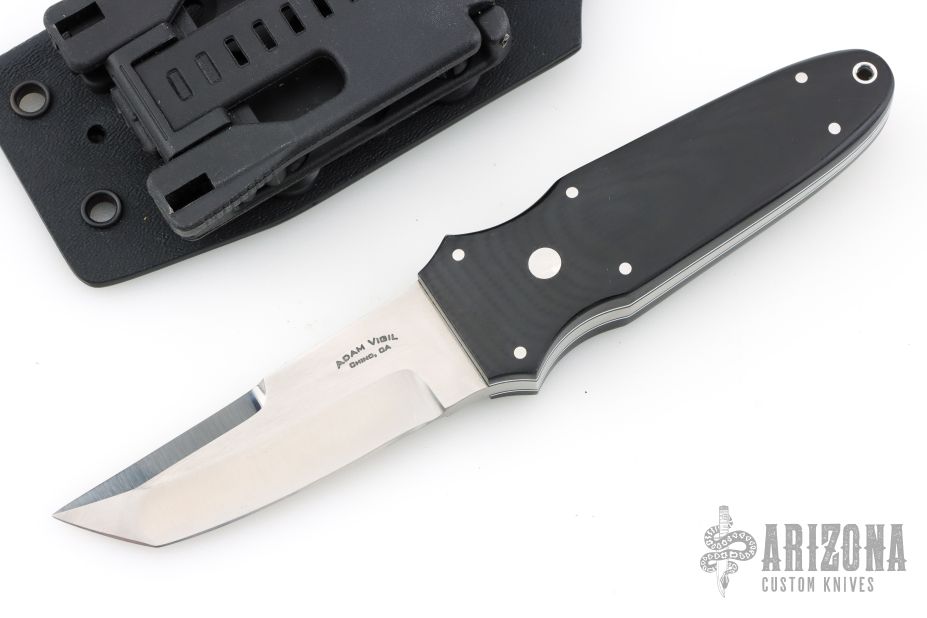 This Small Kwaiken by Adam Vigil features a satin finished blade with false top edge, .184" blade stock and 1.03" blade depth, full tapered tang construction. The handle has contoured black g10 covers and white/black liners with stainless pins and lanyard hole in pommel. Comes with a kydex sheath with TekLok. Has a couple light scuffs, Excellent condition otherwise.