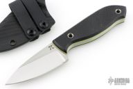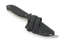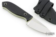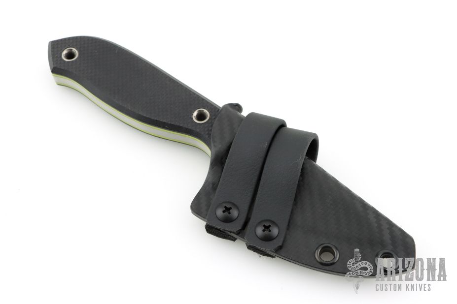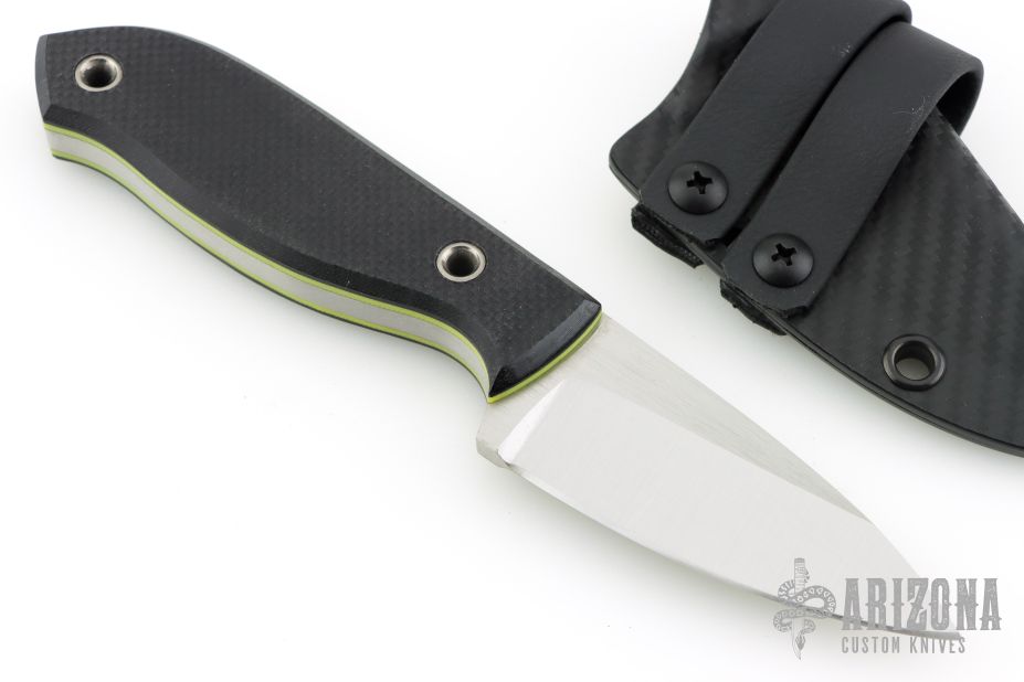 This knife by PieSlicer Knives features a satin finished blade with .198" blade stock and 1.193" blade depth, full tang construction. The handle has textured black g10 covers, yellow liners, and lanyard hole in pommel. Comes with Kydex sheath, zipper case, and maker's card. Has some scuffs and scratches, great overall condition.