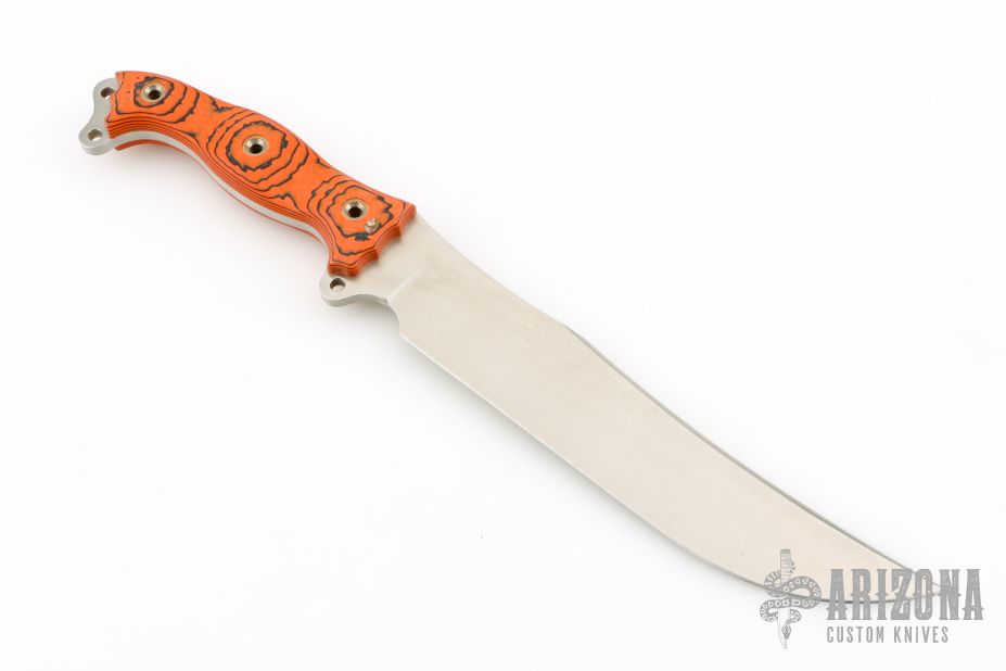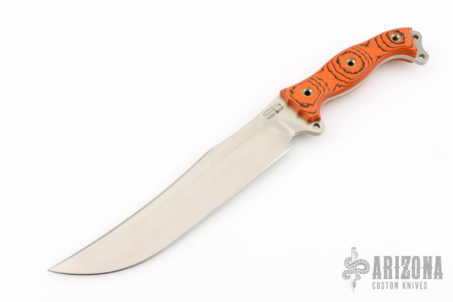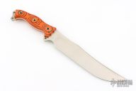 This Nano Fusion Warpatch by Busse features a satin finished blade with .211" blade thickness and 1.682" blade depth, full tang construction. The handle has black/orange G-10 scales. Excellent condition.