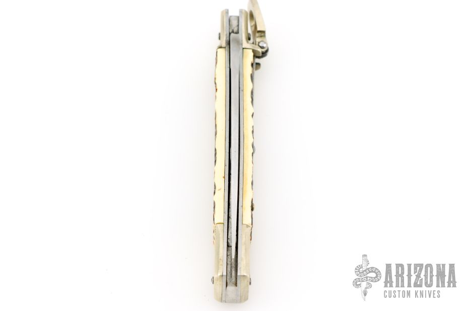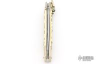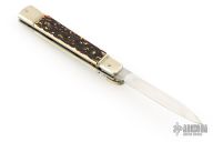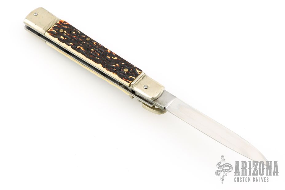 This leverlock auto by Hubertus features a high polish blade, nickel silver double bolsters, faux stag scales, and brass liners and pins. Opens with a nice snap. Very fast opening. Has a couple light scuffs and scratches, great condition otherwise.
