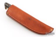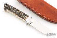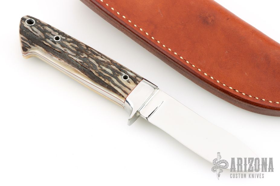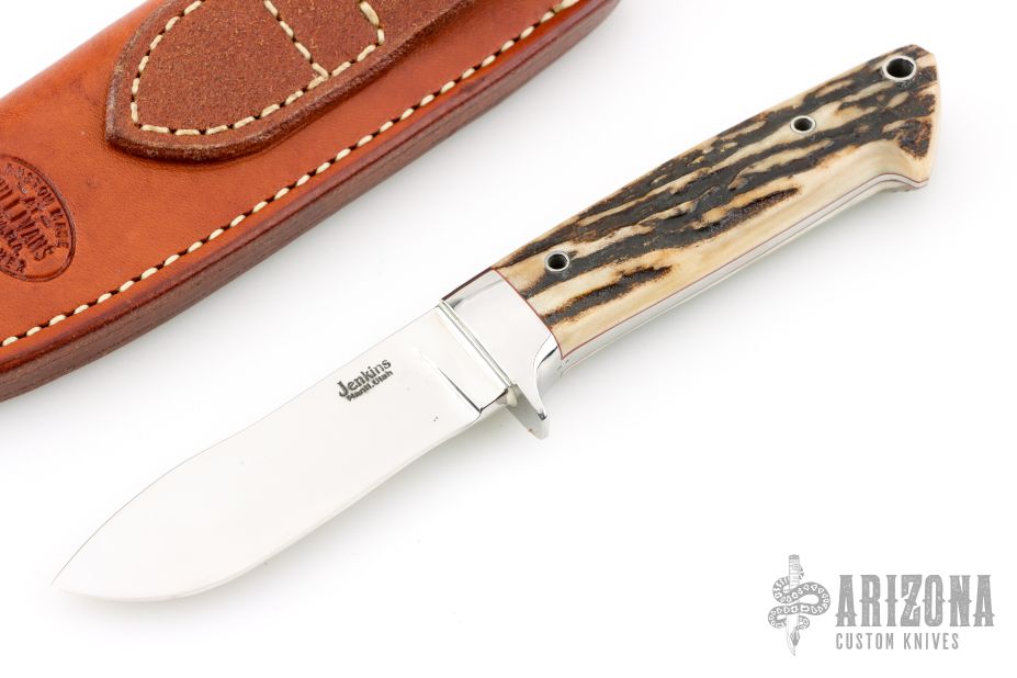 This Semi-Skinner by Mitch Jenkins features a mirror polished blade, mirror polished 416 stainless steel fittings, and stag scales with red liners, .202" blade thickness and .951" blade depth, full tapered tang construction. Excellent fit and finish. Comes with brown leather sheath. New from maker.