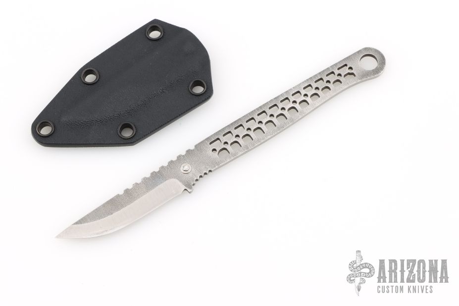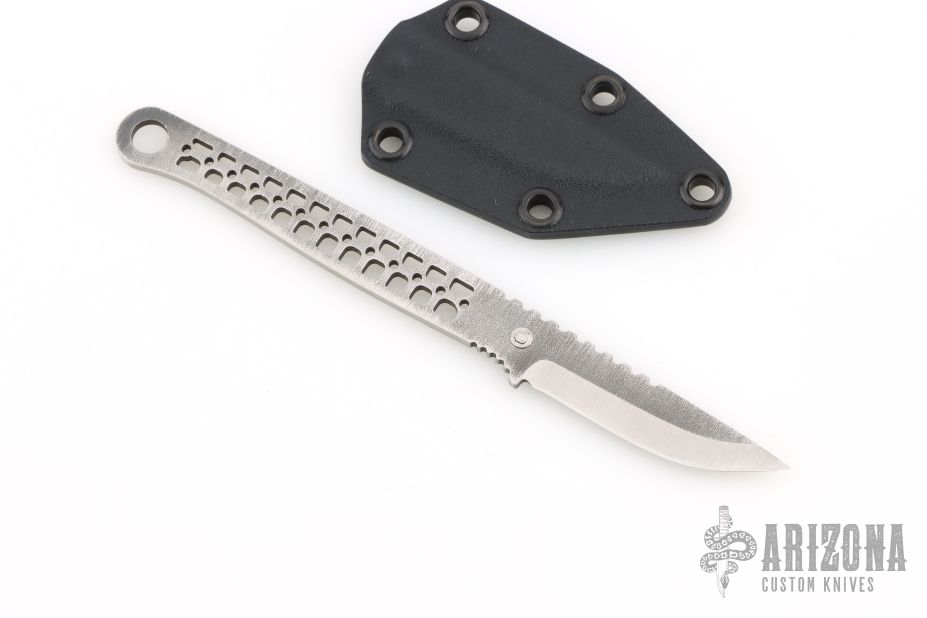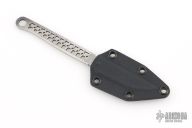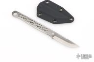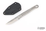 This Scalpel V5 by Hot Metal Knives features a satin finished scandi ground blade with notched thumbrest, .099" blade stock and .609" blade depth, full skeletonized tang construction. The handle has a rivet near the ricasso that holds the knife in the sheath. 13c26 Sandvik Stainless 59hrc. Comes with original sheath. Excellent condition.
