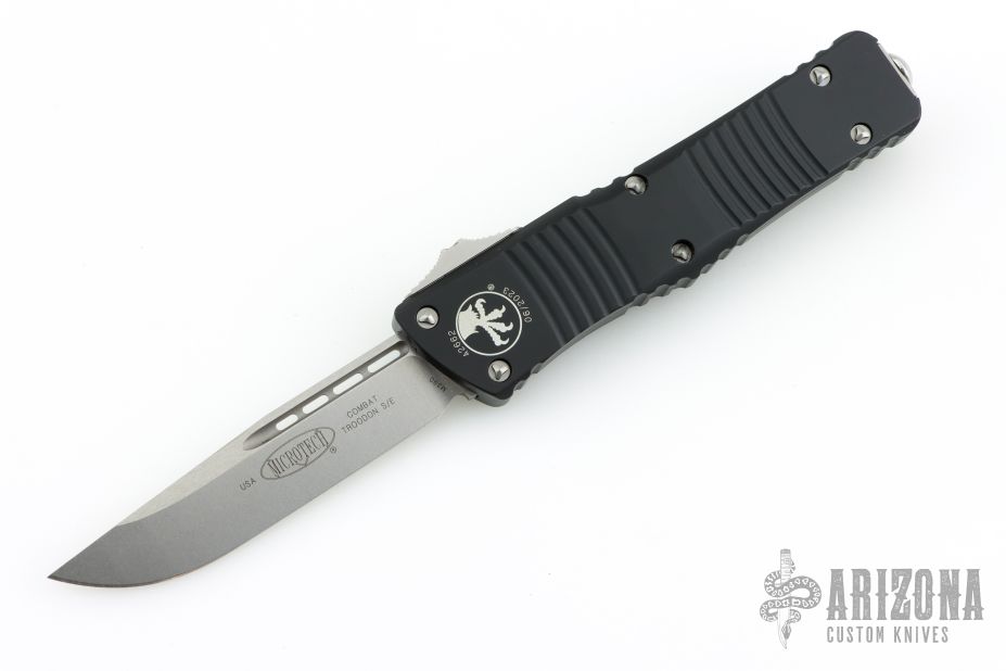 This Combat Troodon OTF automatic features a stonewashed S/E blade with a standard edge. Stainless steel clip, tip down carry. Glass breaker. S/N #42662 . Date 06/2023. Comes with original box and papers. The Glass breaker is included and has a hex screw holding the clip in place currently. Excellent Condition.