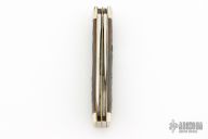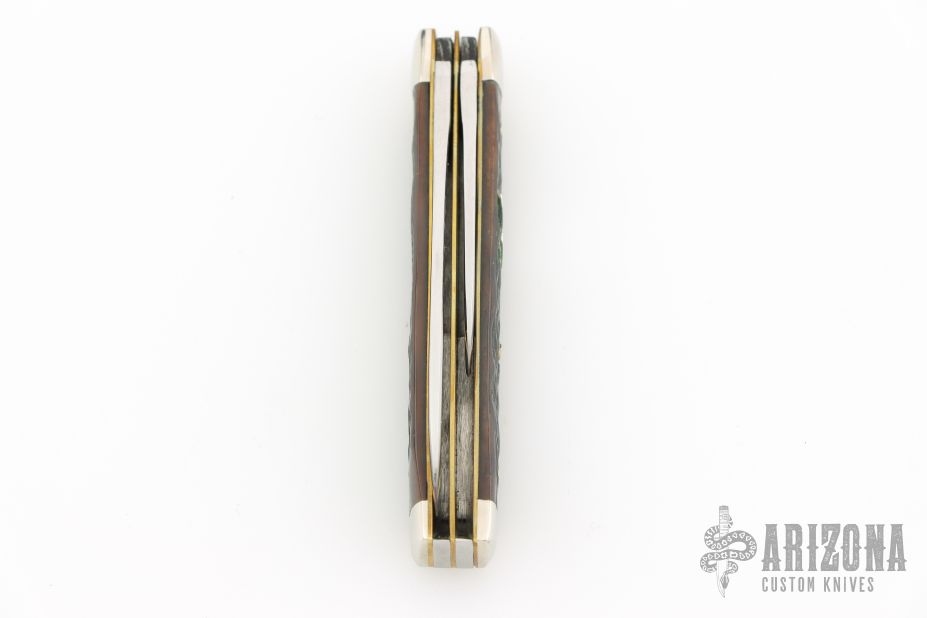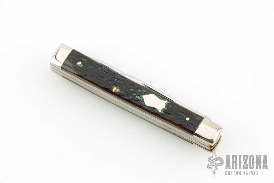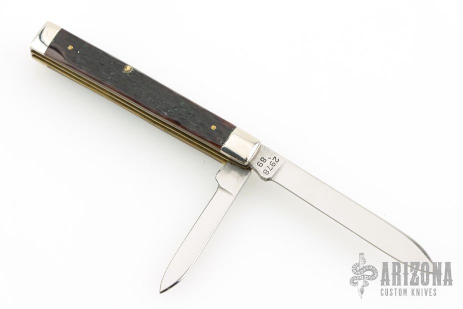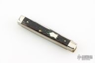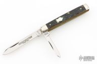 This Winchester folder features two mirror polished blades. Nickel Silver front and rear bolsters with jigged bone covers. Brass liners and steel springs. Original box. Has some light scratches, Excellent condition.