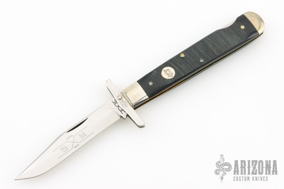 This swing guard lock back by Queen Steel and Schatt and Morgan features a mirror finished blade with nail nick. The handle has nickel silver bolsters and swing guard, black sawcut Delrin scales, brass liners, stainless steel spring. Has some light scratches, otherwise excellent condition.  Dated 1992