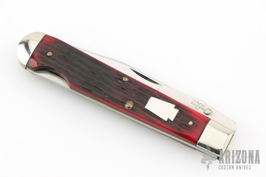 This lockback by Schatt & Morgan features a satin finished blade with nail nick. The handle has nickel silver bolsters, red bone covers, steel guard, brass liners and stainless steel spring. Excellent condition. Comes with original box.