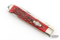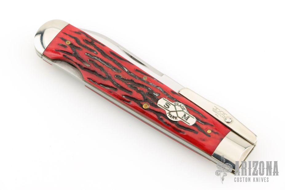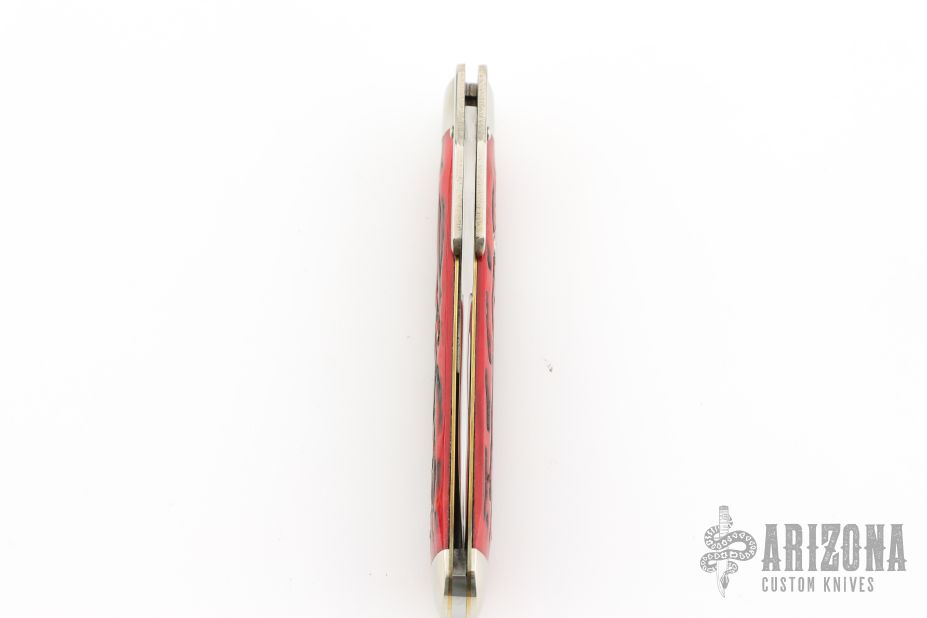 This lockback by Schatt & Morgan features a satin finished blade with nail nick. The handle has nickel silver bolsters, red bone covers, silver guard, brass liners and stainless steel spring. Excellent condition. Comes with original box.