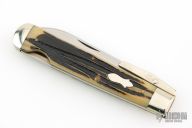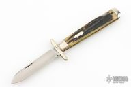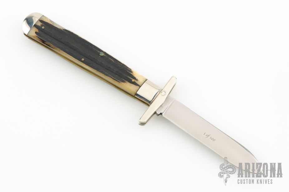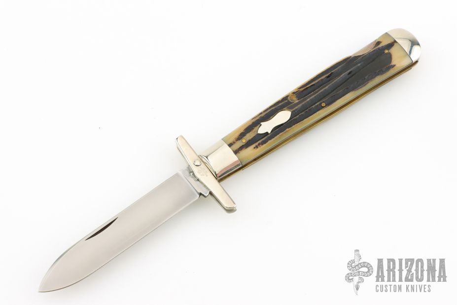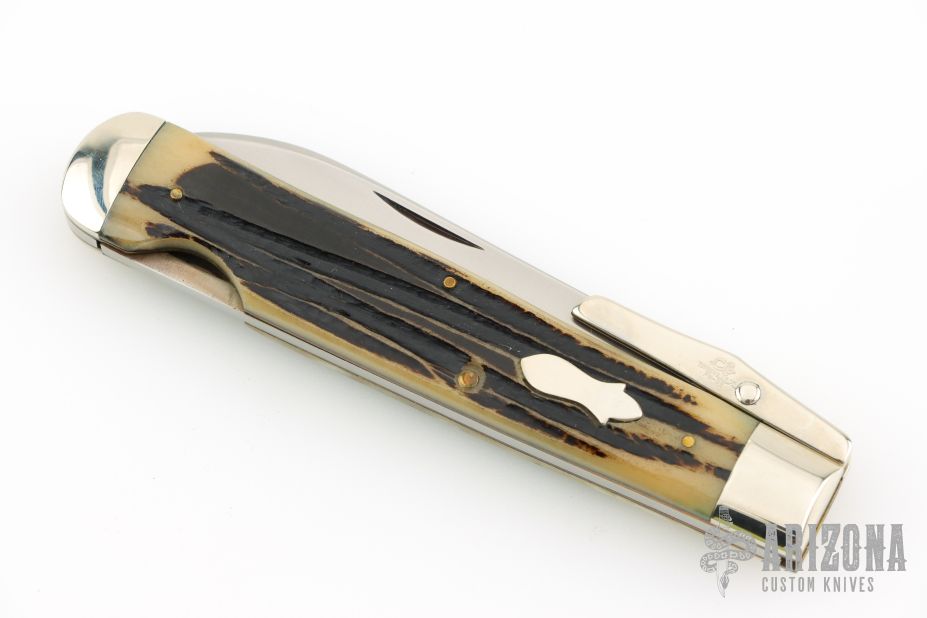 This swing guard lock back by Queen Steel features a satin finished blade with nail nick. The handle has nickel silver bolsters and swing guard, stag scales, brass liners, stainless steel spring. Has some light scratches, otherwise excellent condition.