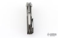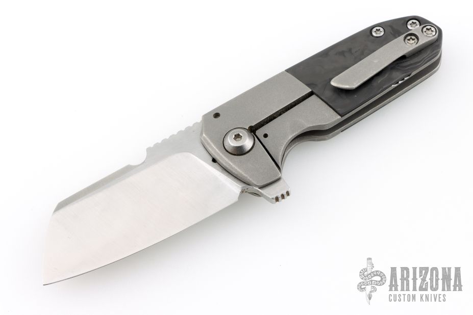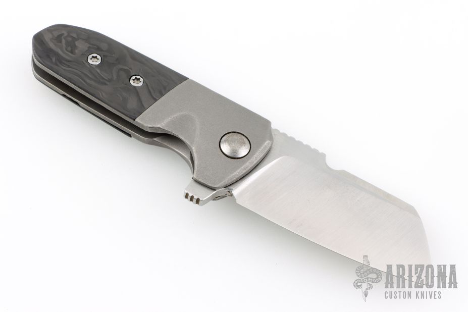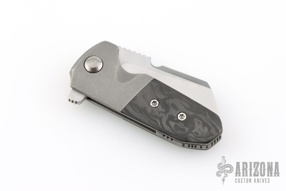 This Custom Left Handed Micro Soyuz by Morrish Made Knives features a satin finished blade with swedge, notched thumbrest and flipper. The handle has a nicely contoured titanium frame with a tumbled egg shell finish, marble carbon fiber scale, matching titanium tip up clip and backspacer. Rides on bearings, nice detent, lockup and blade seating. Has some scuffs, otherwise excellent condition. Comes with a zippered case. Dated 2019 and #4 inside the frame.