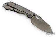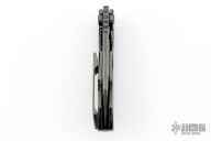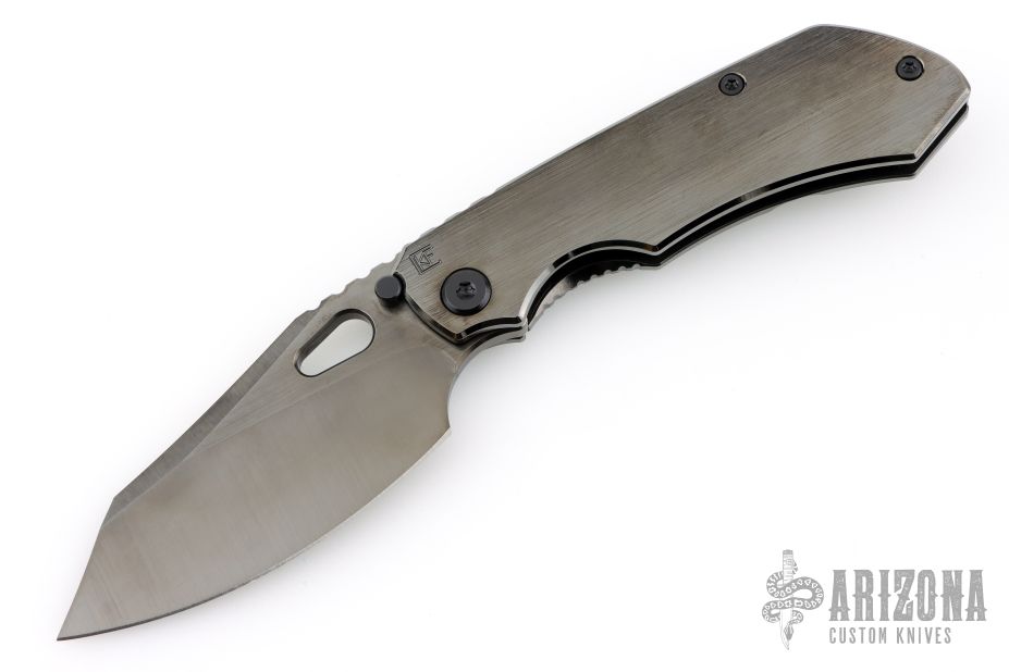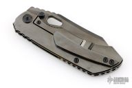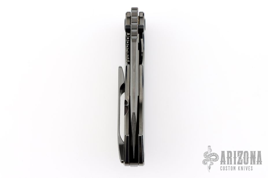 This Evolution 3.0 by Custom Knife Factory features a black satin finished blade with notched thumbrest and thumbhole. The handle has a black bark finished titanium frame with a matching tip up clip and backspacer. Comes with velcro case, extra hardware and COA. Nice detent, lockup and blade seating. #700 and dated 12-22. New condition.