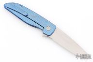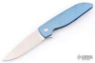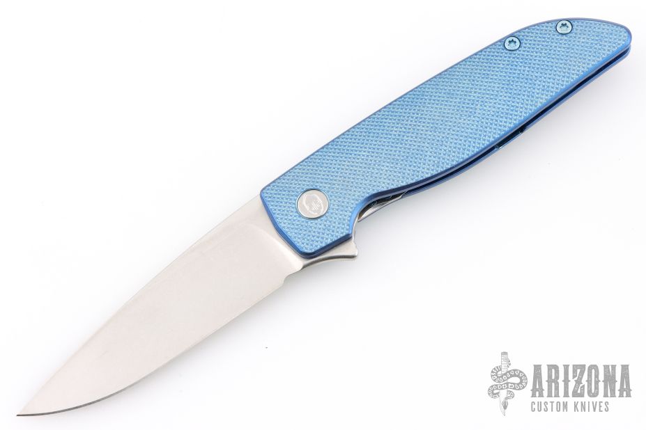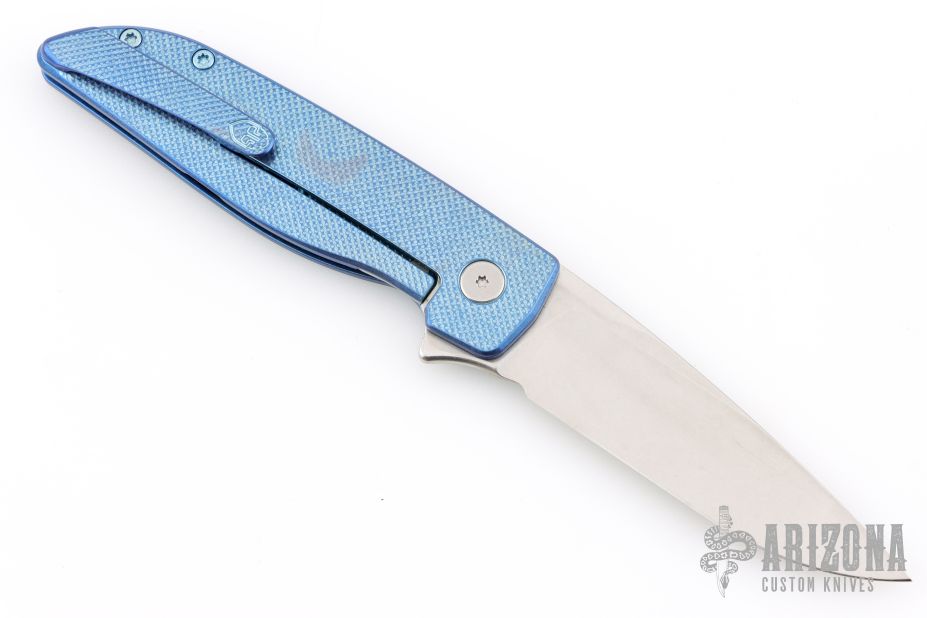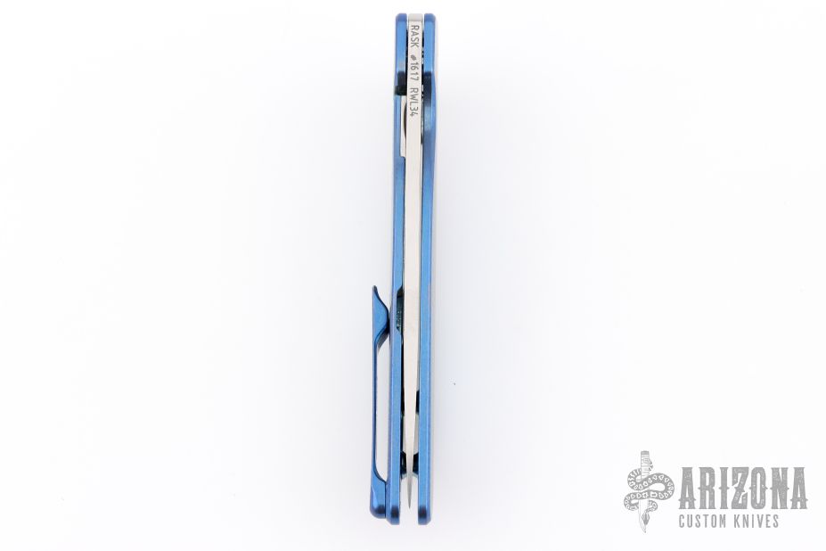 This Rask by John Grimsmo of Grimsmo Knives features a stonewash finished blade with notched flipper. The handle has a "Crosshatch" milled/anodized/tumbled titanium frame with matching tip up clip that has hidden screws, titanium barrel spacers and screws. Numbered #1617 on the spine of the blade. Includes original box and COA dated Feb 14, 2023. Excellent condition.