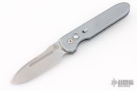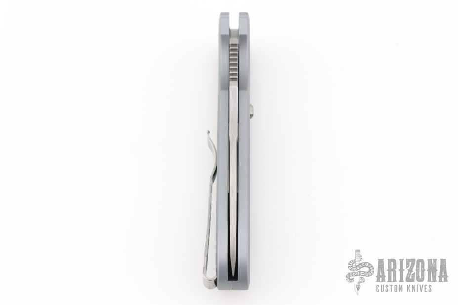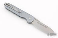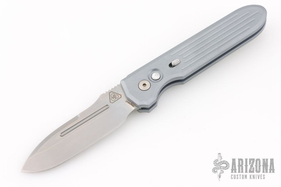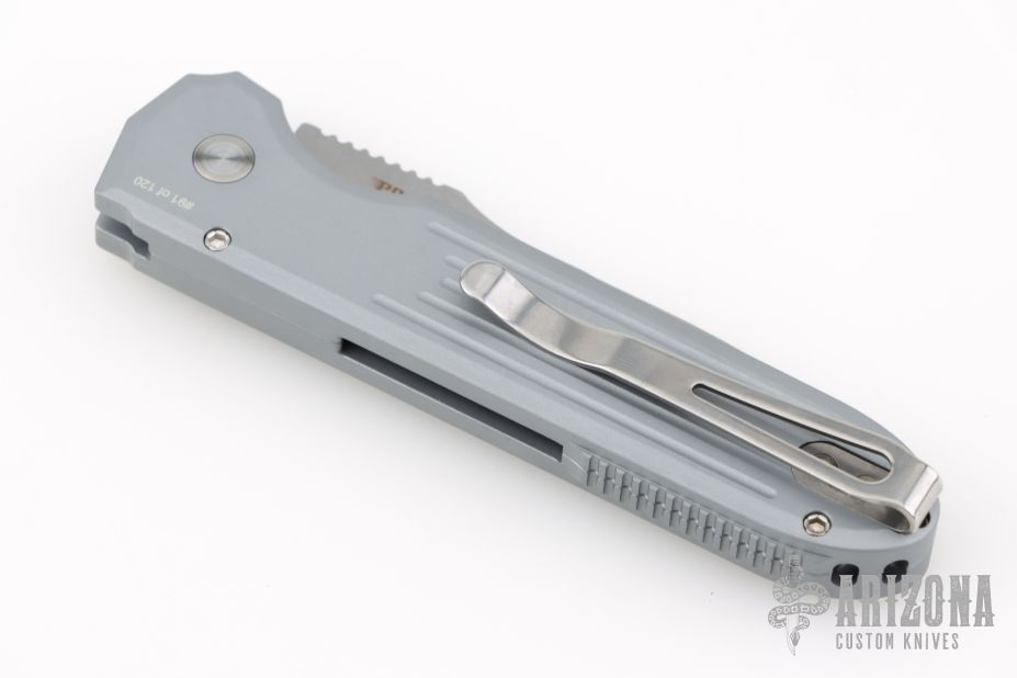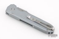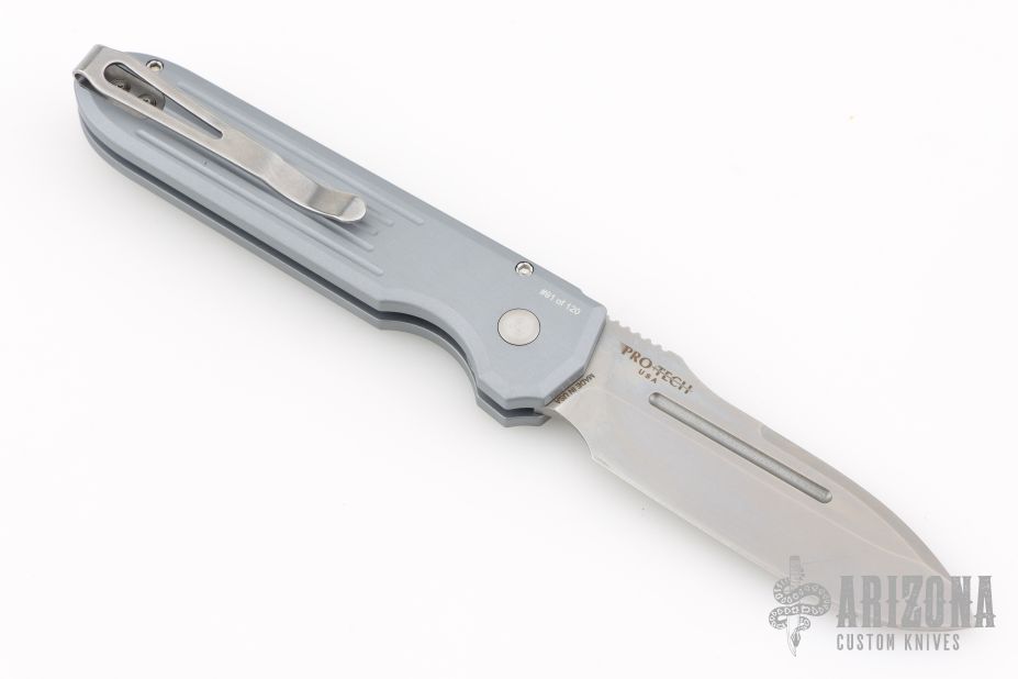 This Invictus by Pro-Tech is a Prometheus Design Werx design, it features a stonewashed blade with fullers and notched thumbrest.  The handle has a grey aluminum frame with a stainless steel tip up clip, lanyard hole at the butt. Push button with mother of pearl inlay and a safety. Comes with original box and papers. S/N 91 of 120. Excellent condition.